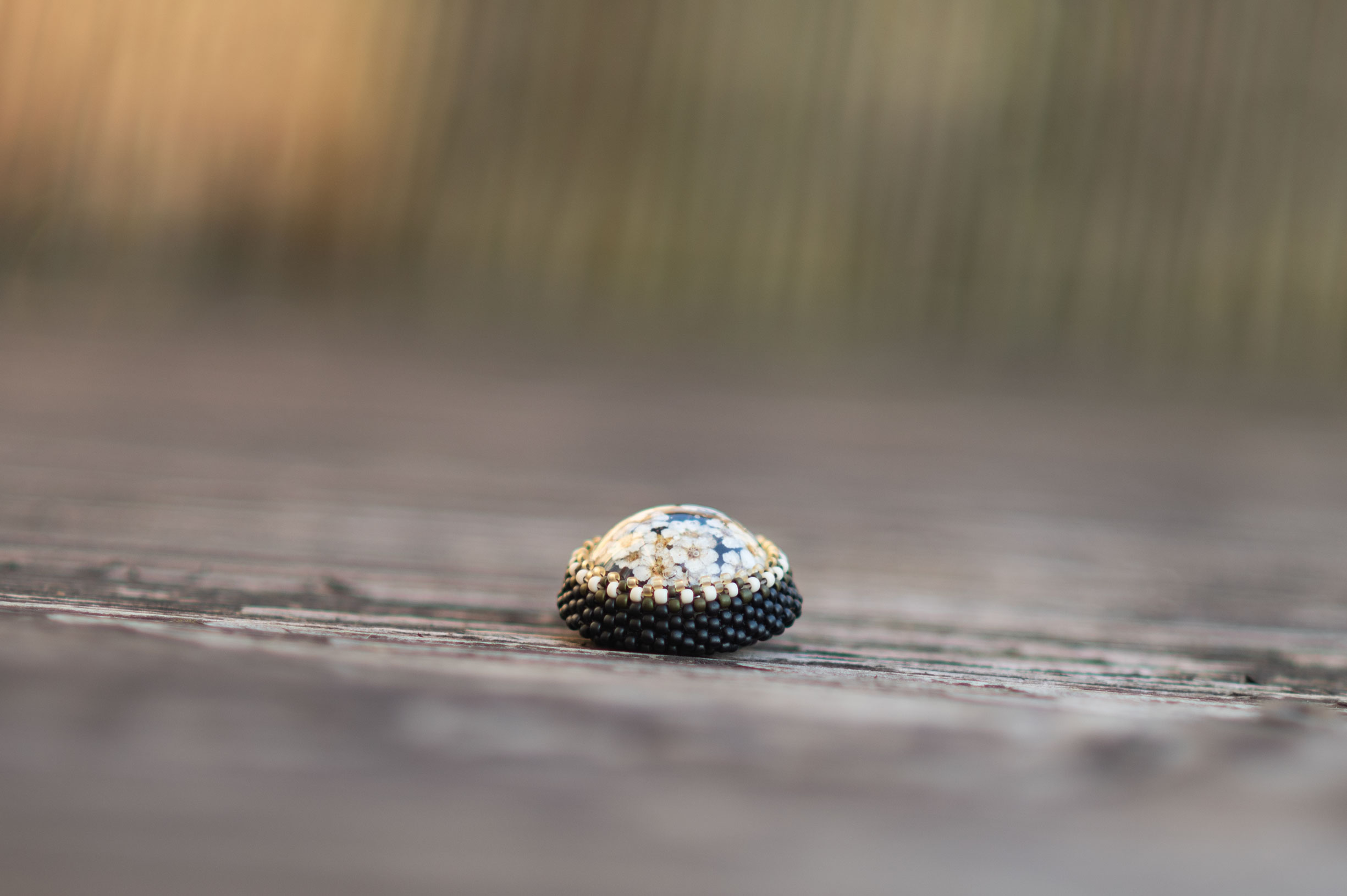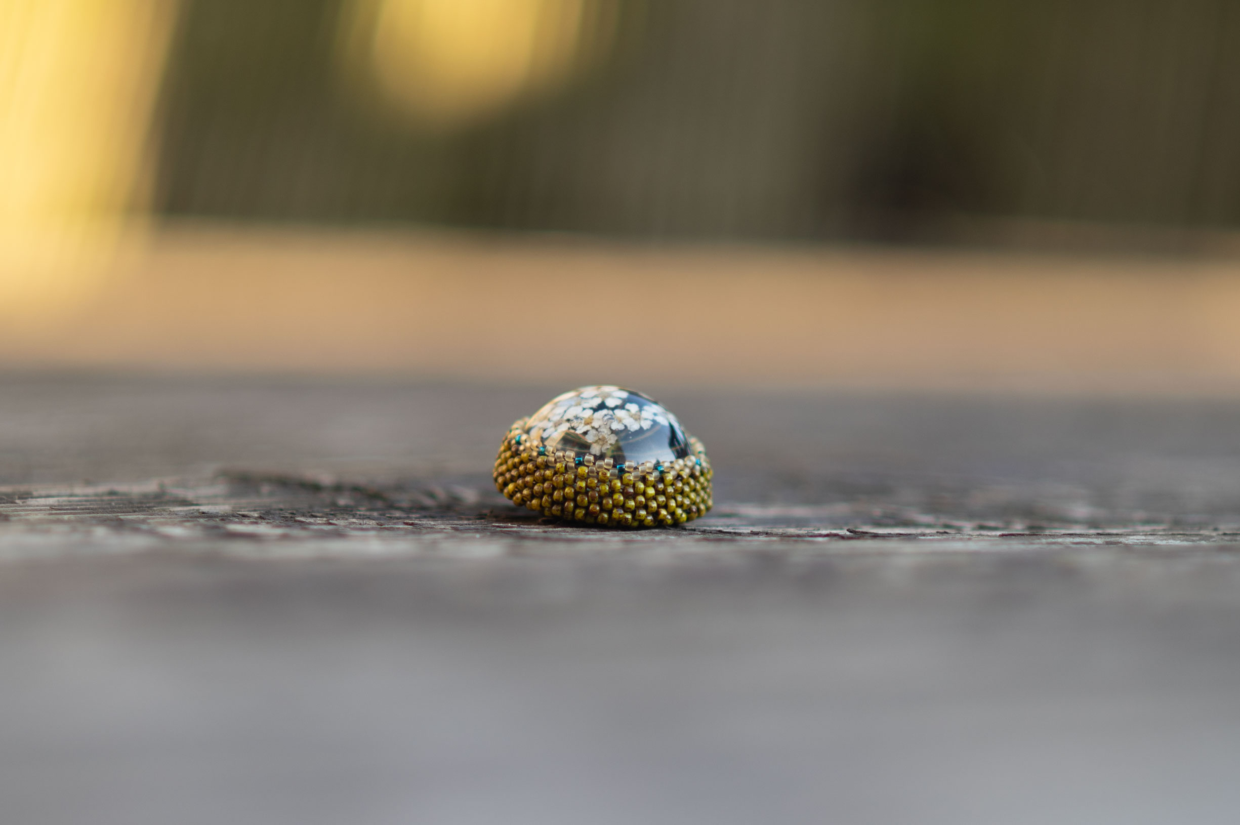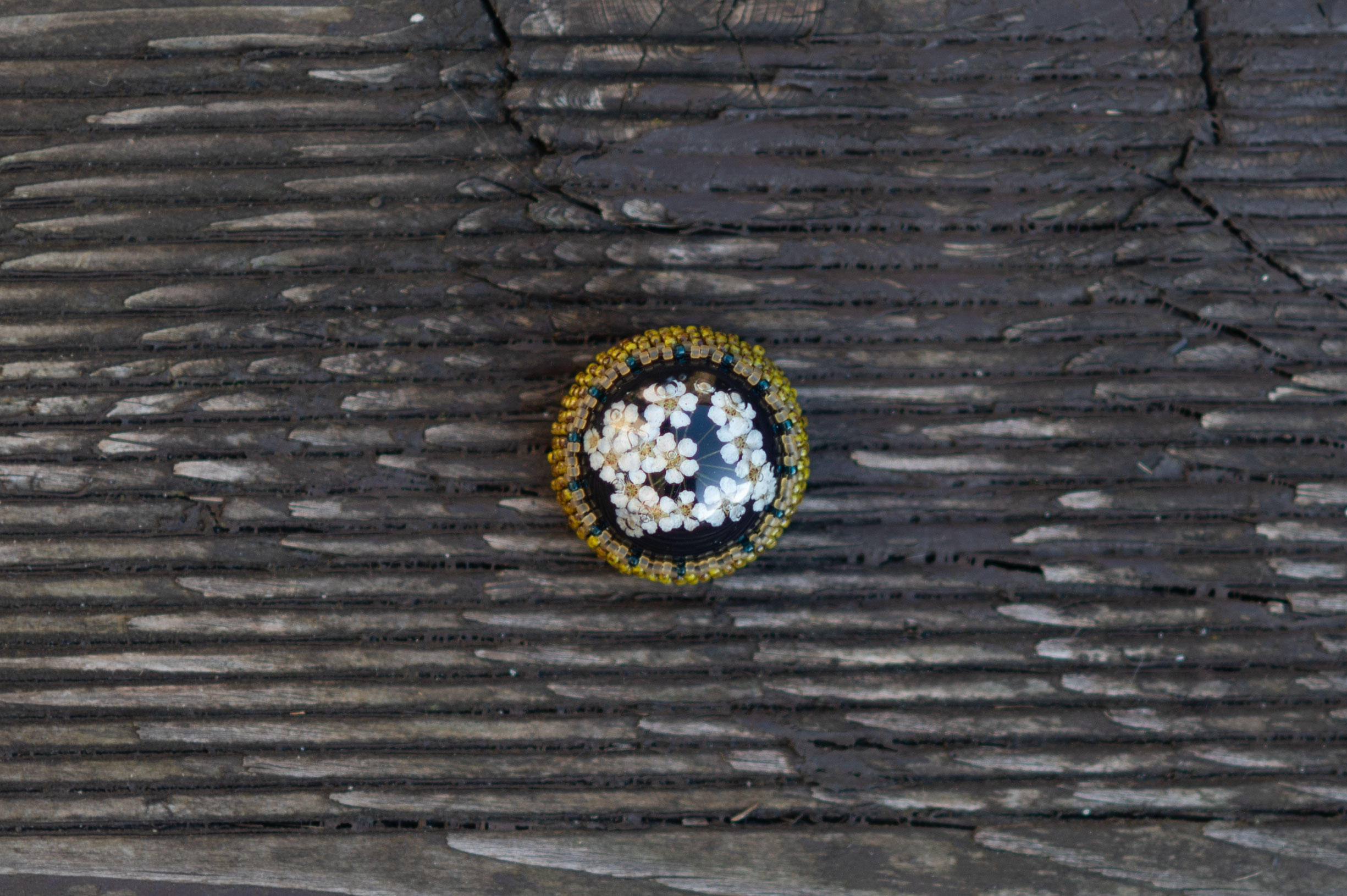 Kwiaty tawuły zatopione w żywicy. Całość została wykończona haftem koralikowym.