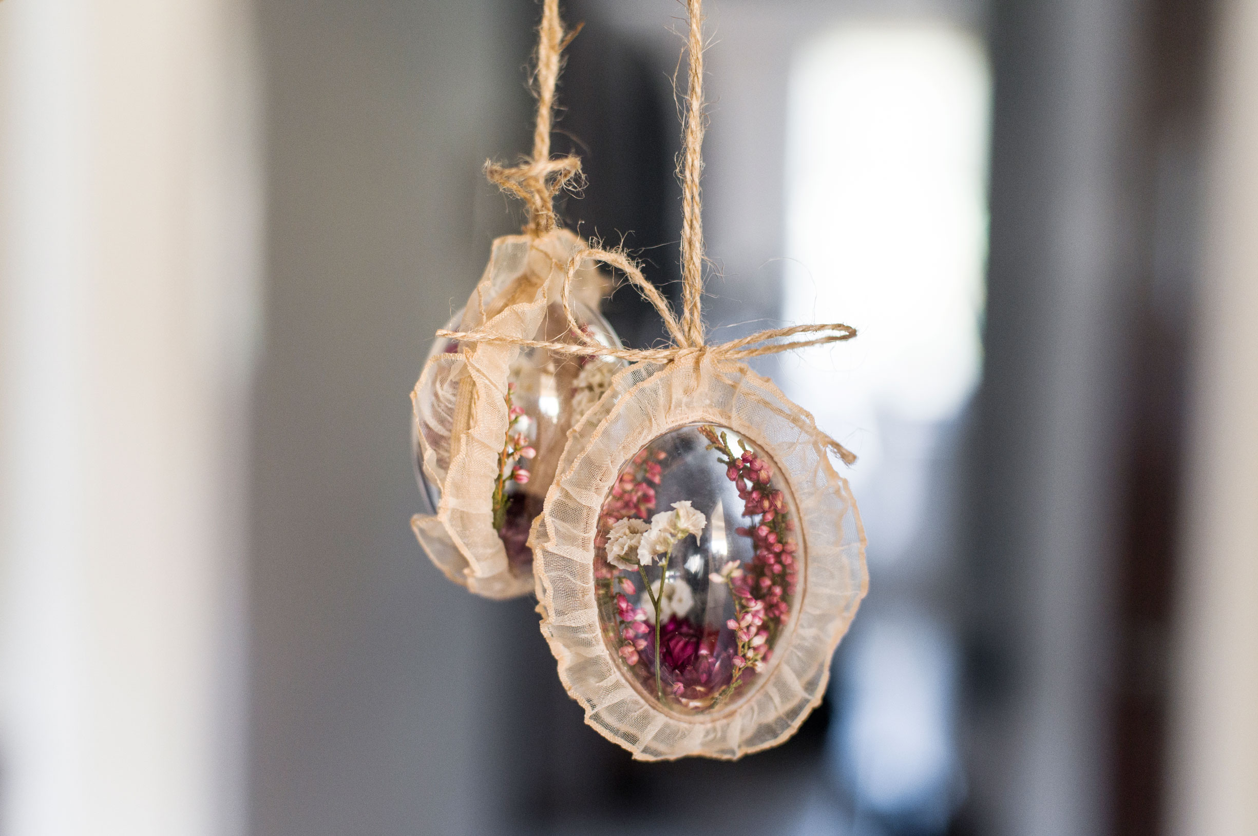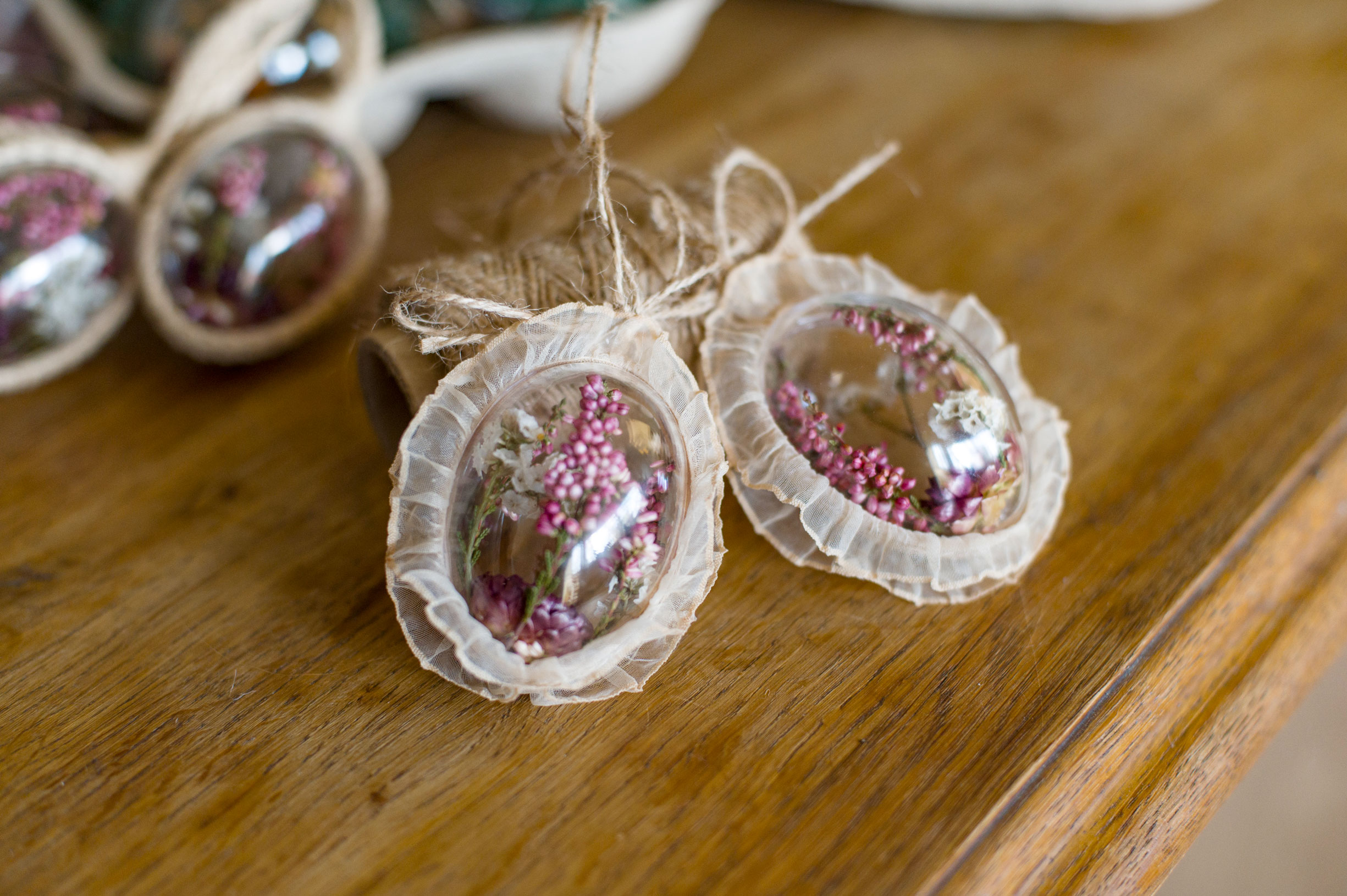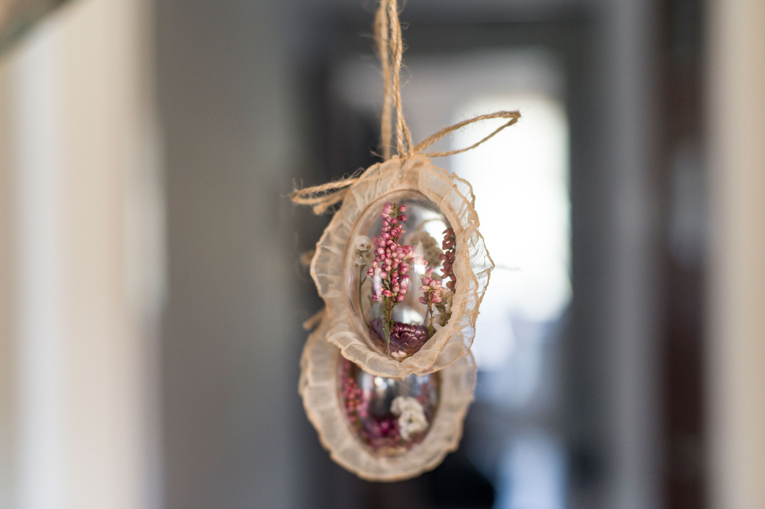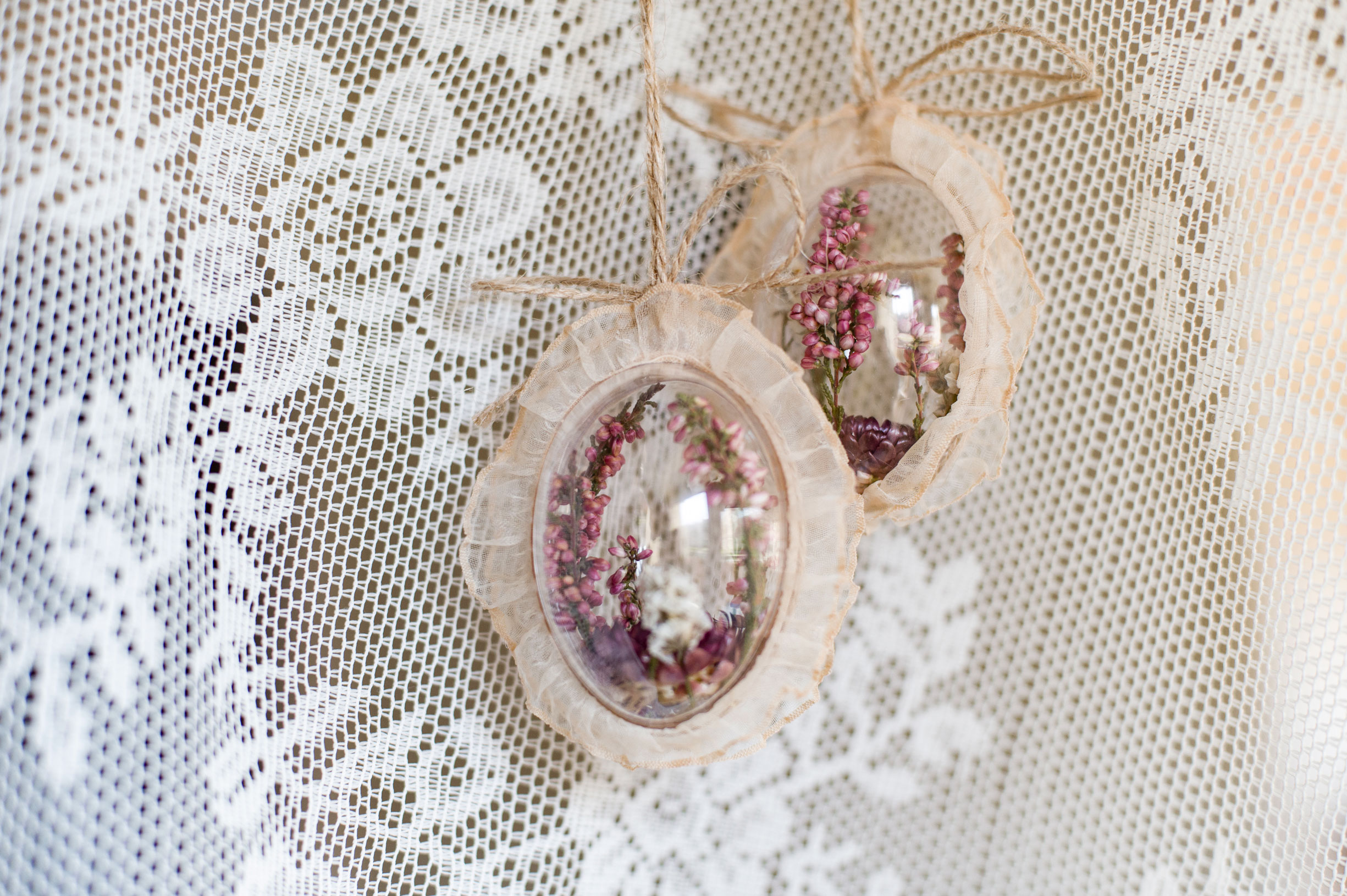 Akrylowe jajeczka z ciemnoróżową kocanką, wrzosem, zatrwianem, beżową falbanką oraz sznurkiem jutowym 🙂