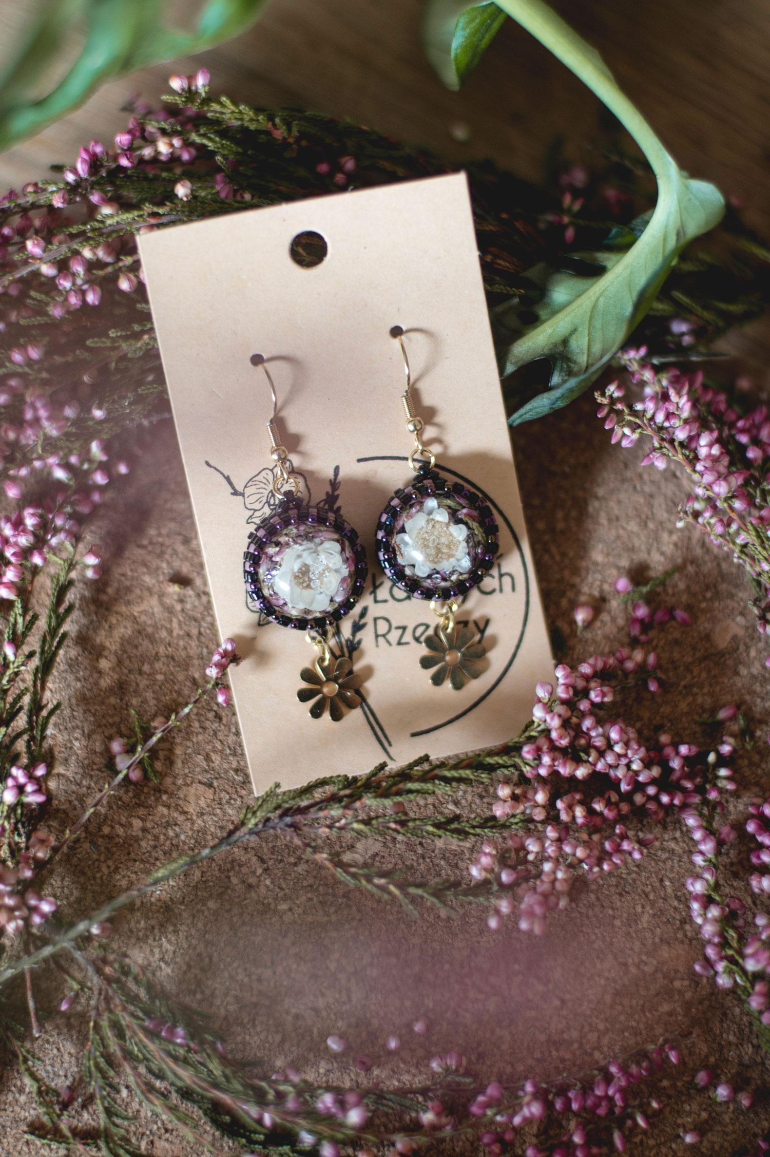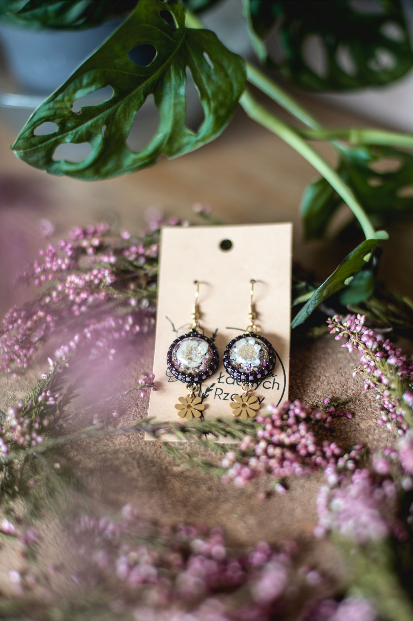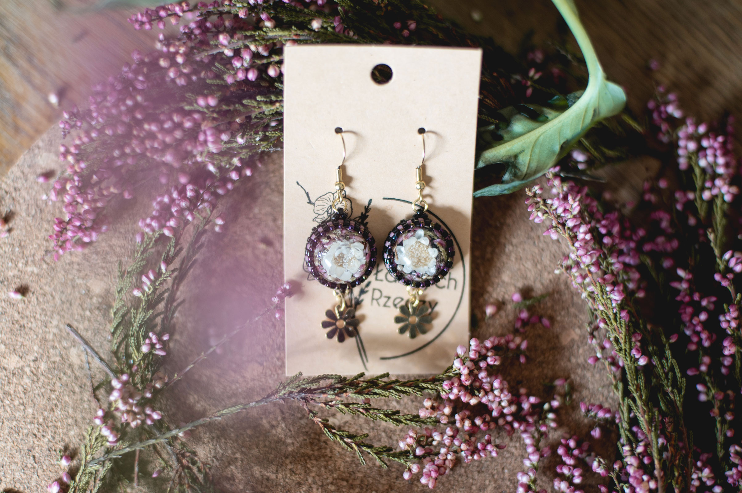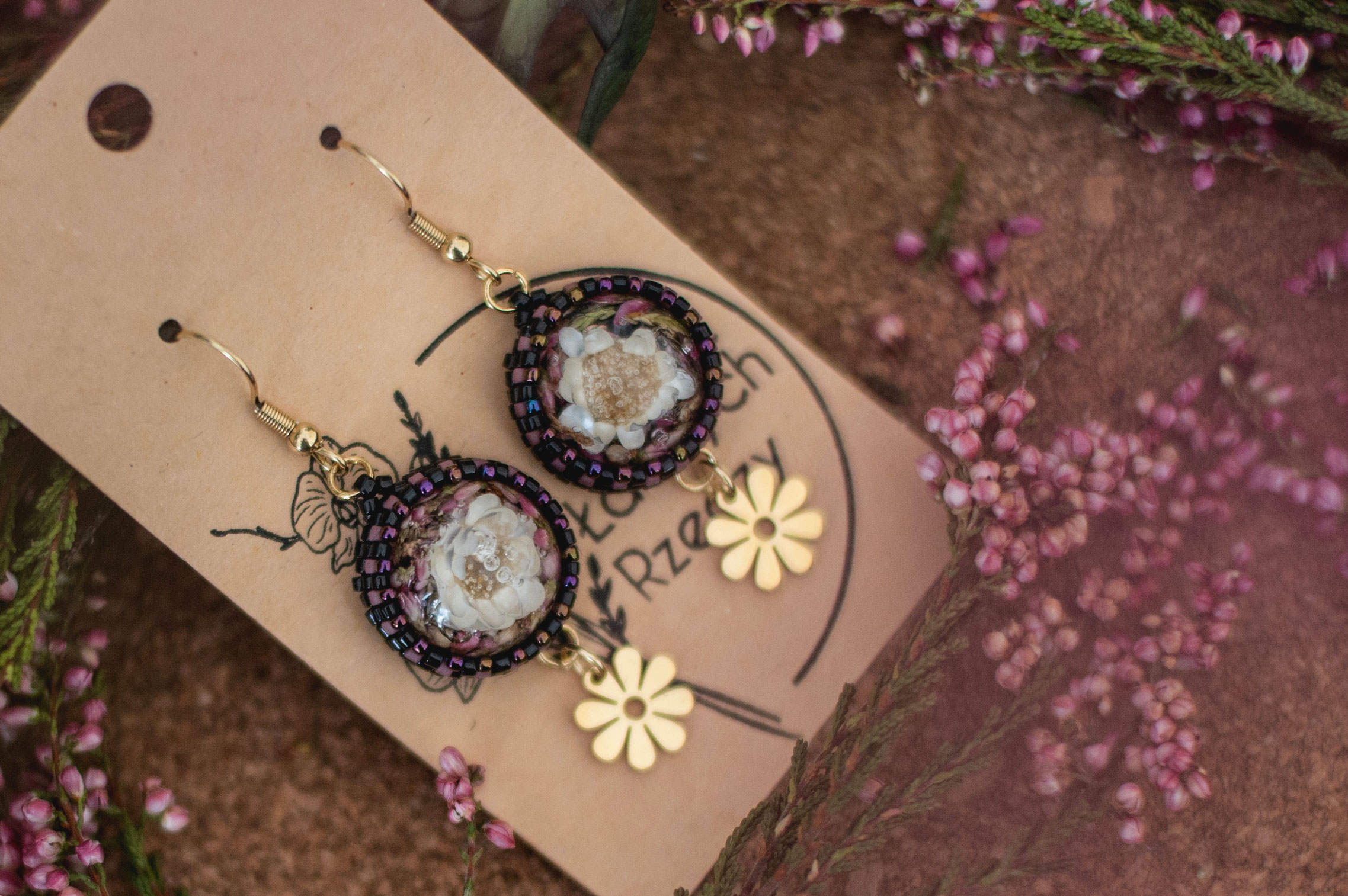 Wrzos i biała glixia zatopione w żywicy.
