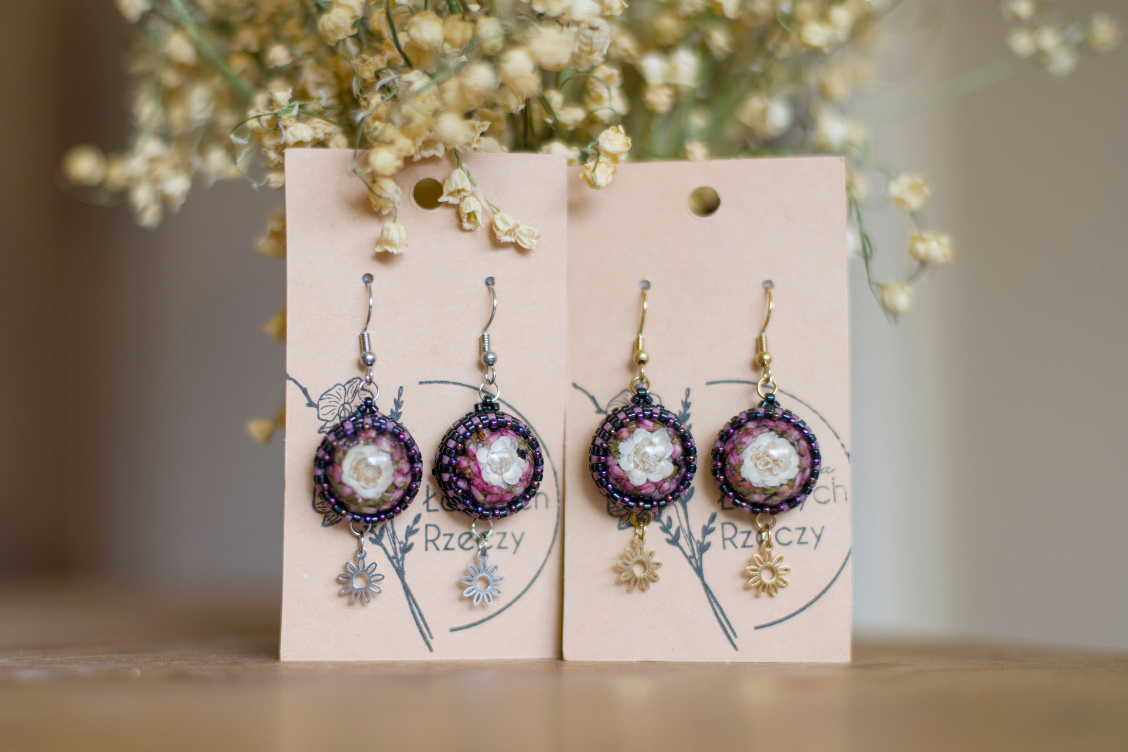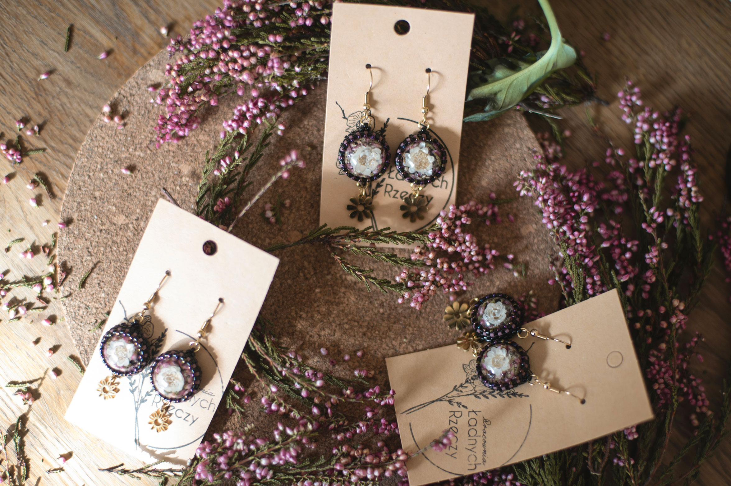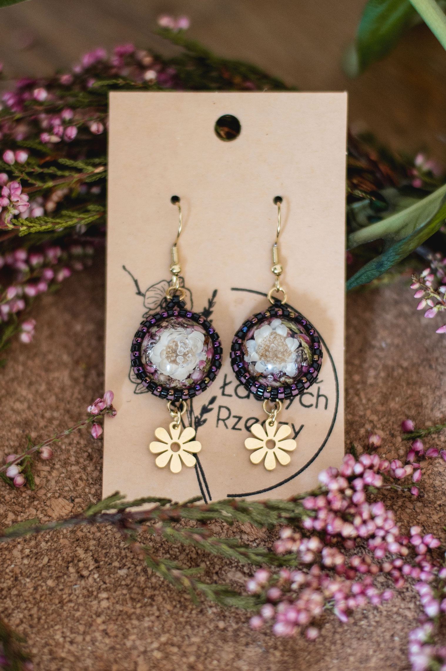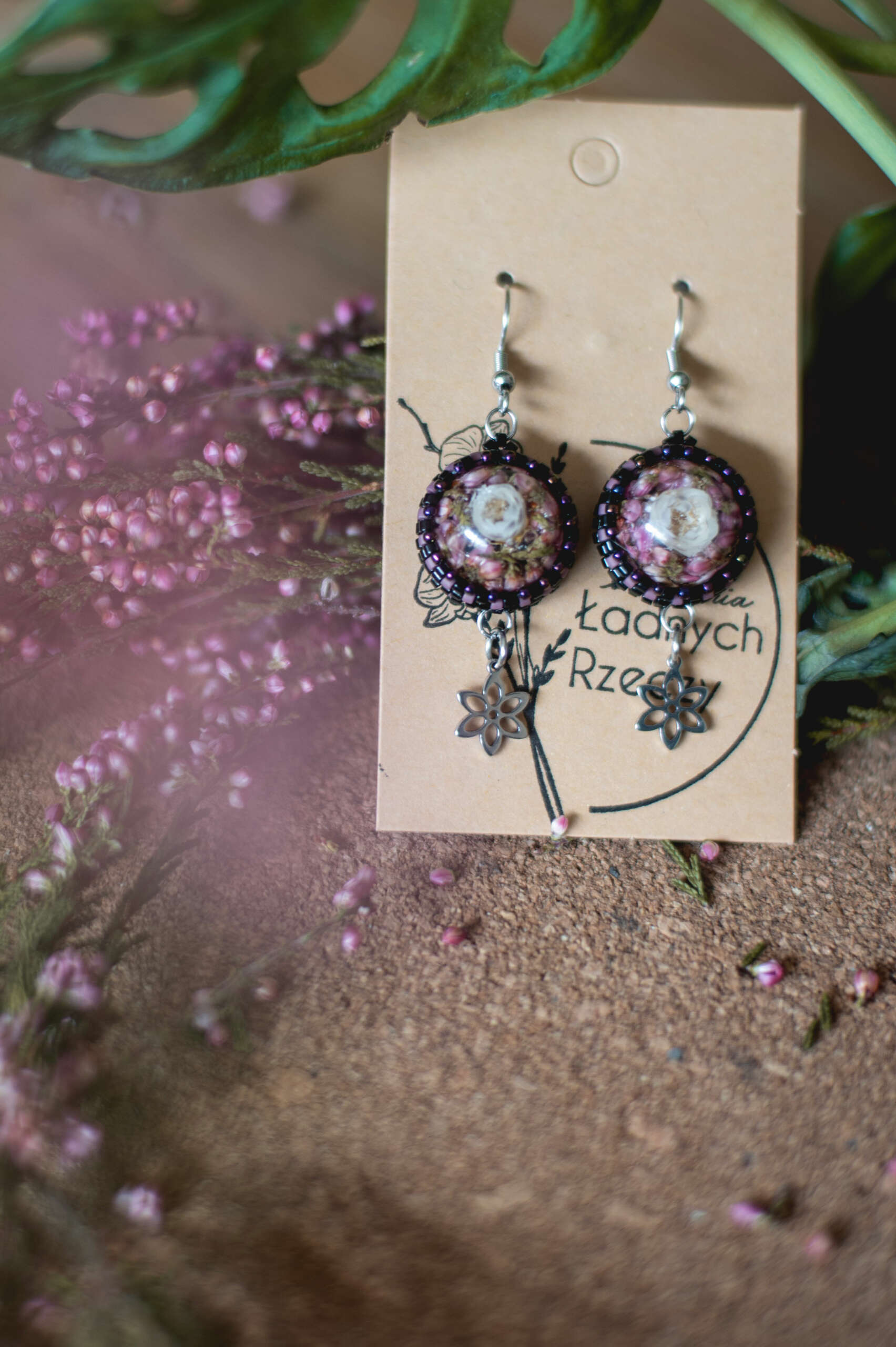Wrzos i biała glixia zatopione w żywicy.