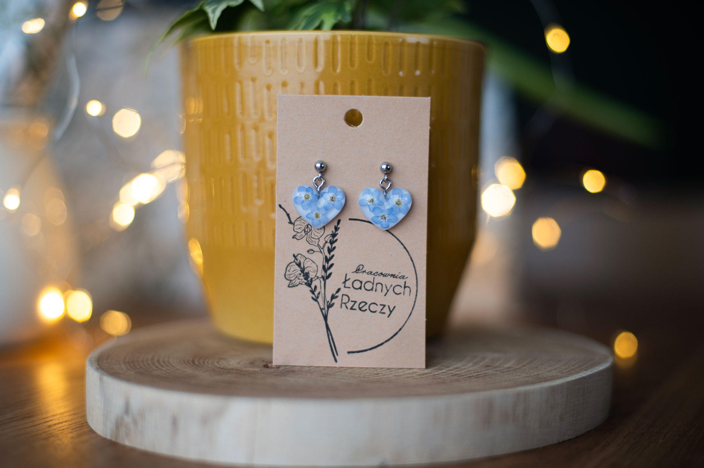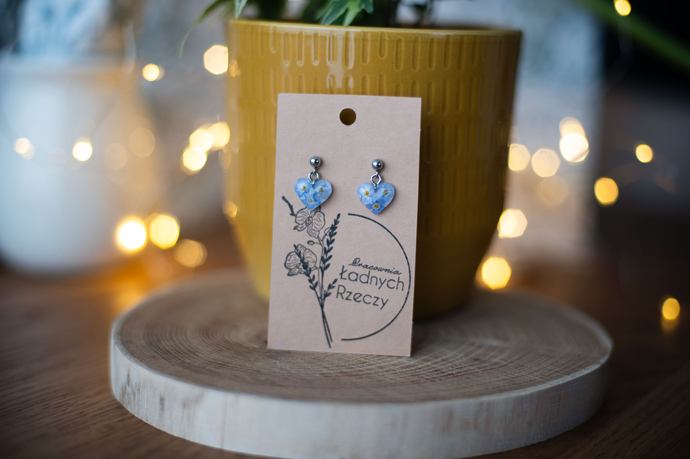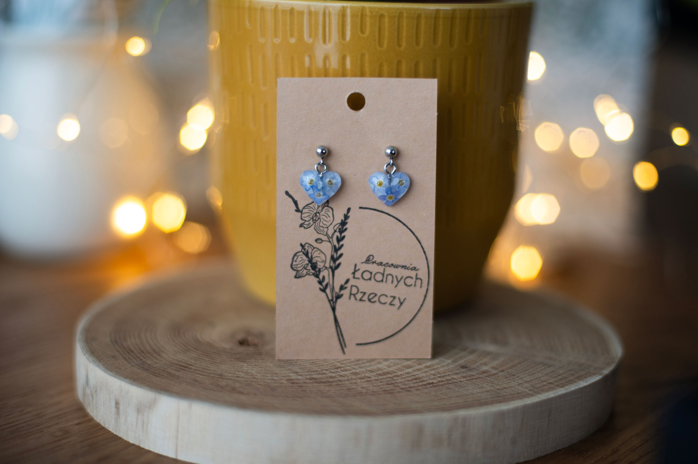 Niezapominajka zatopiona w żywicy, na białym tle. Sztyft z kuleczką wykonany jest ze stali chirurgicznej.