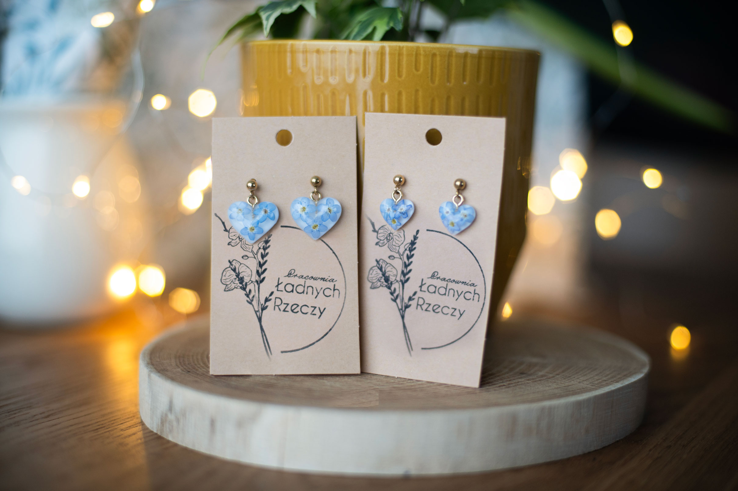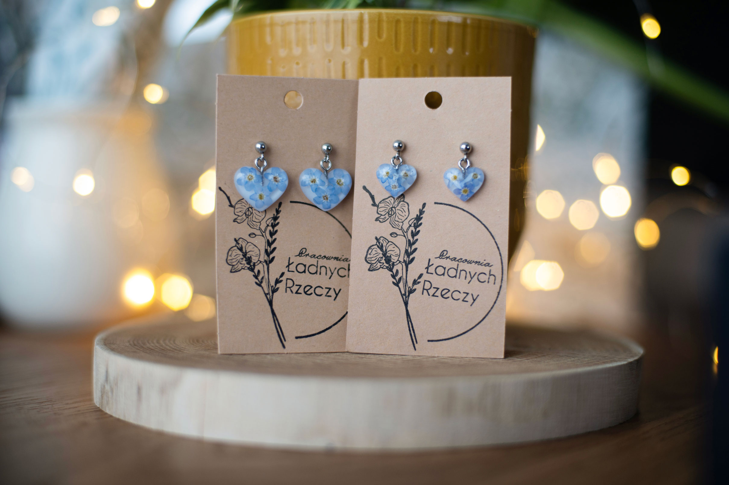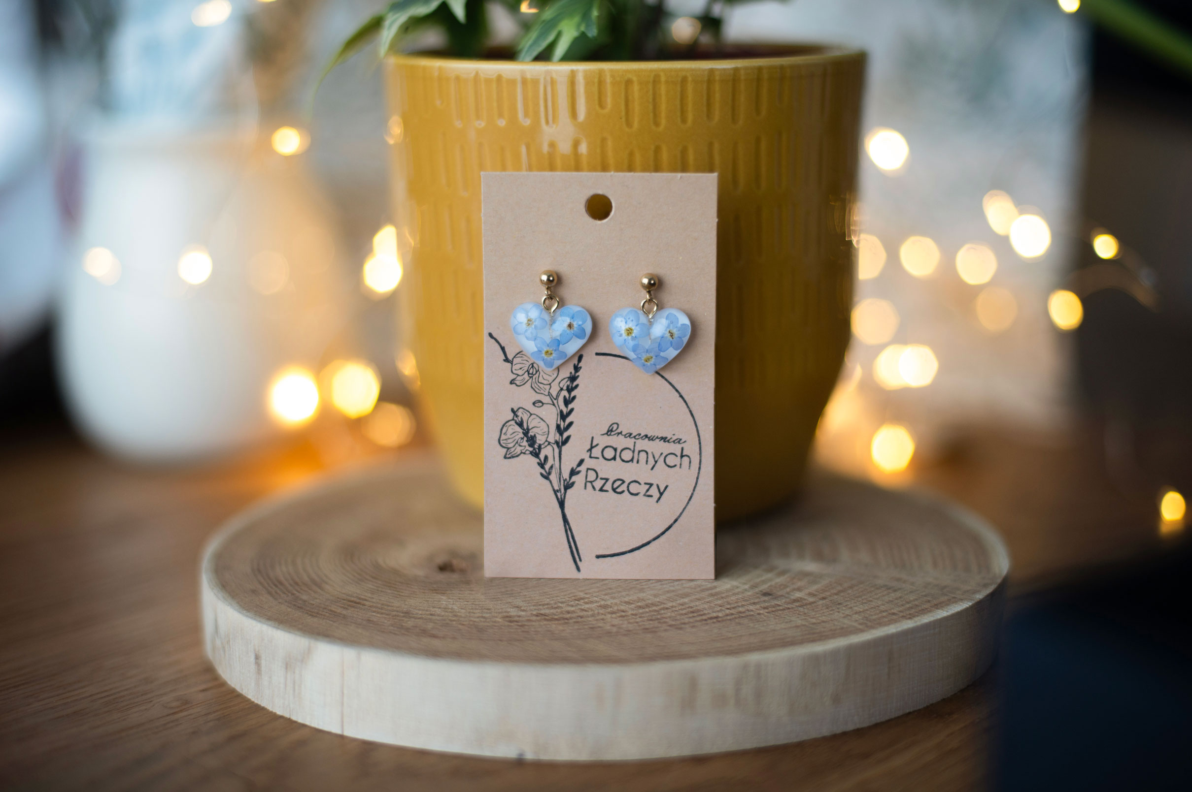 Niezapominajka zatopiona w żywicy, na białym tle. Sztyft z kuleczką wykonany jest ze stali chirurgicznej.