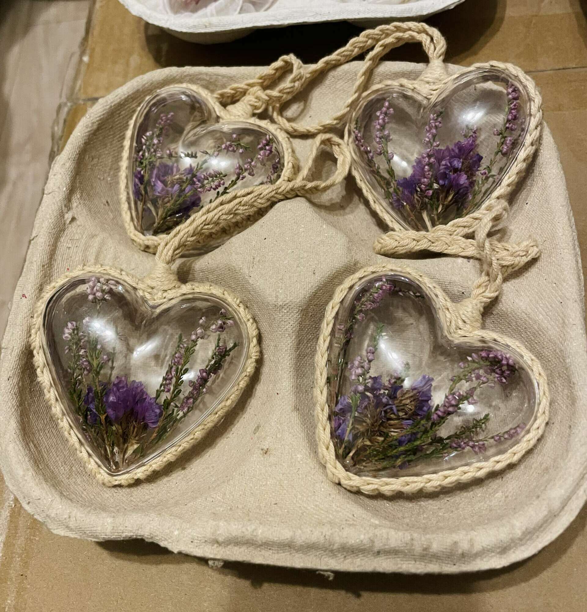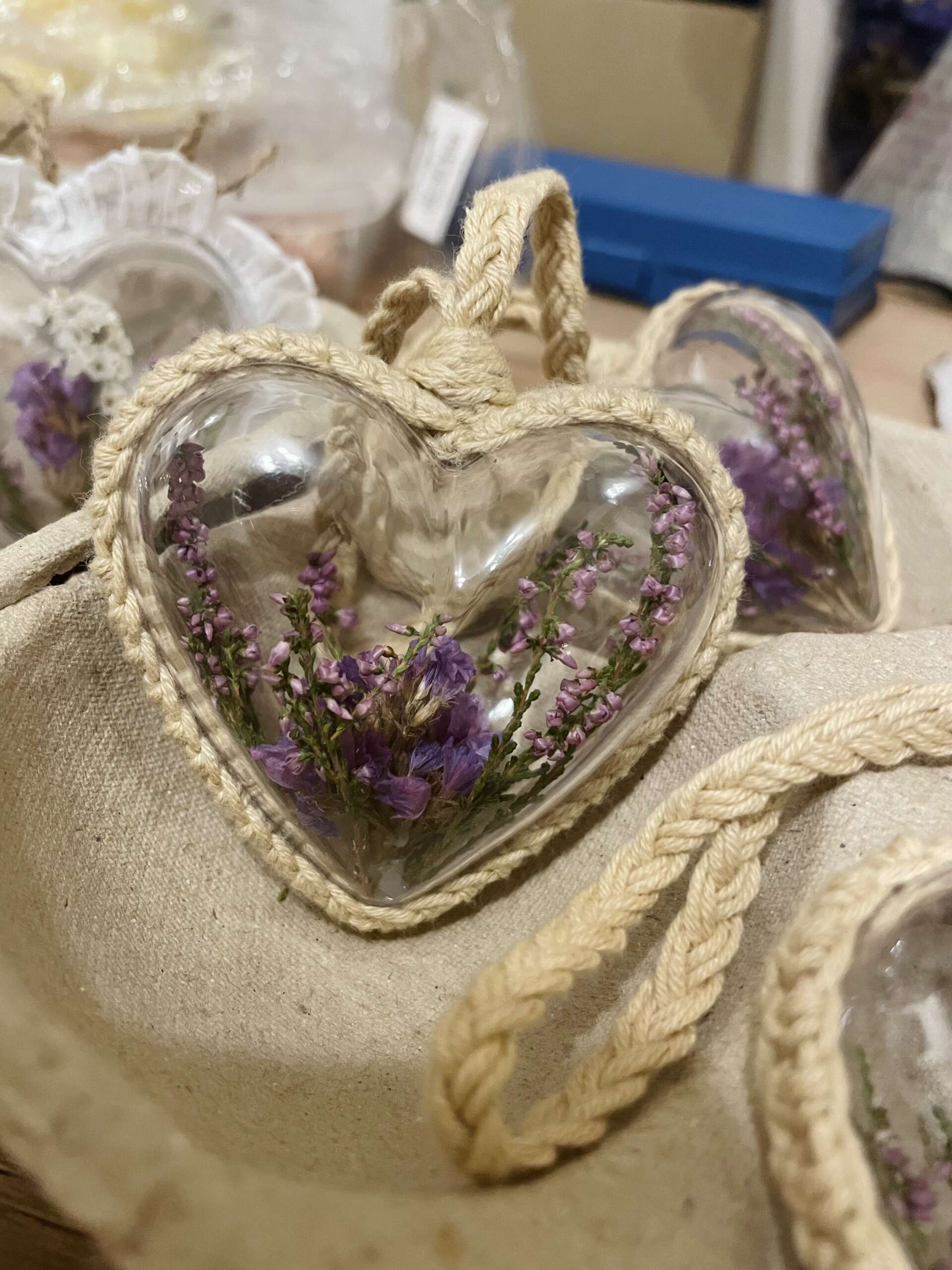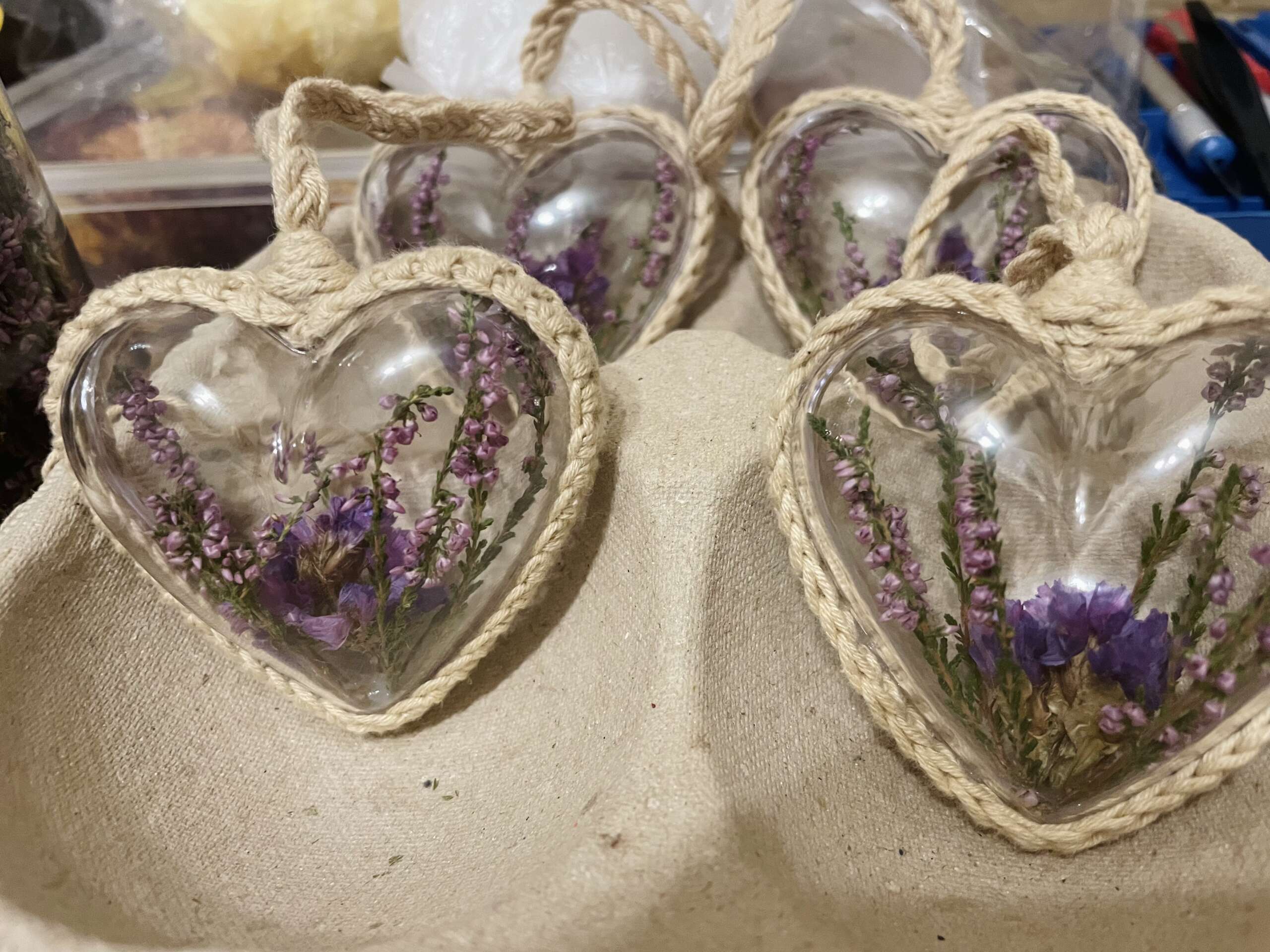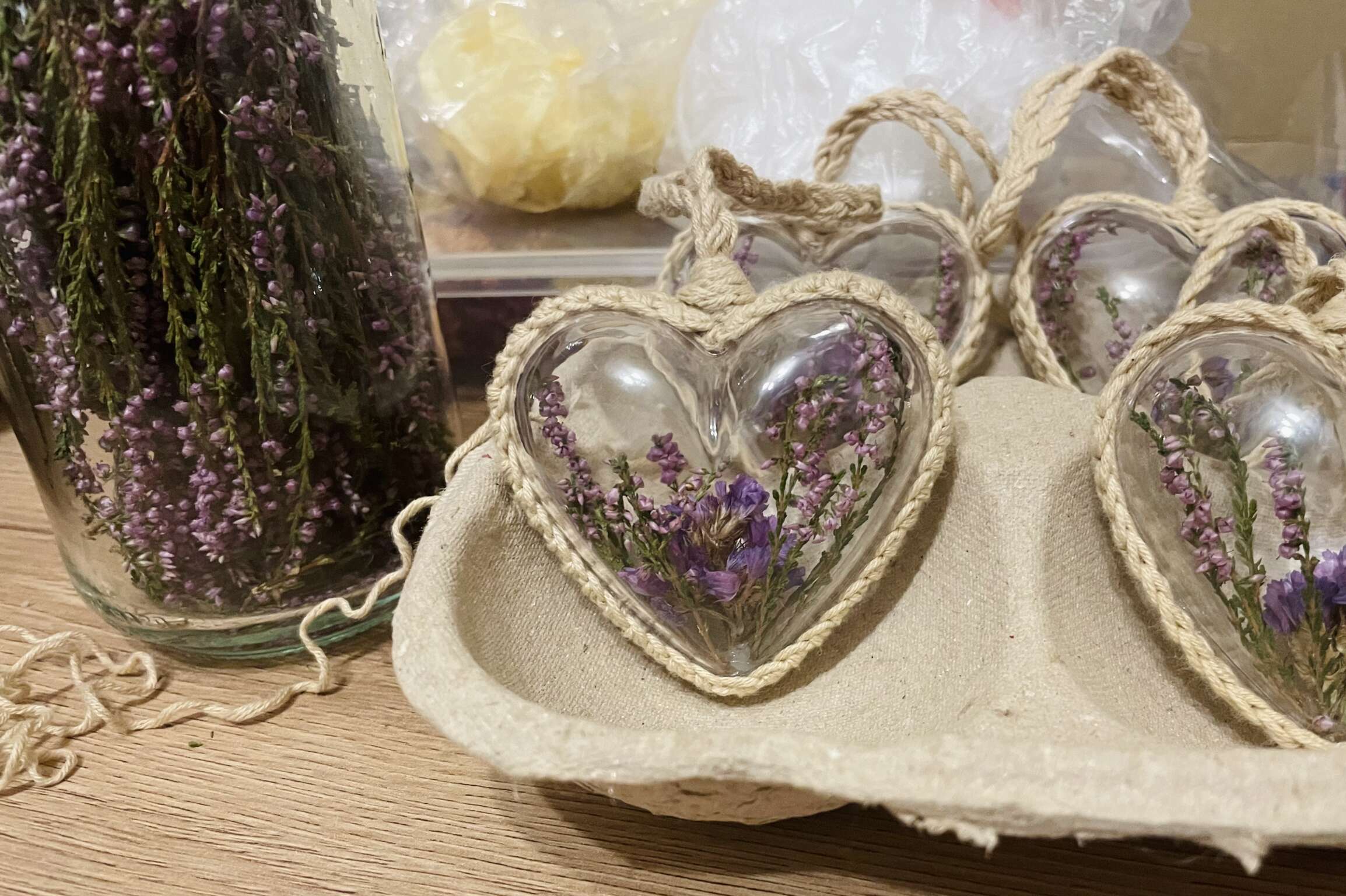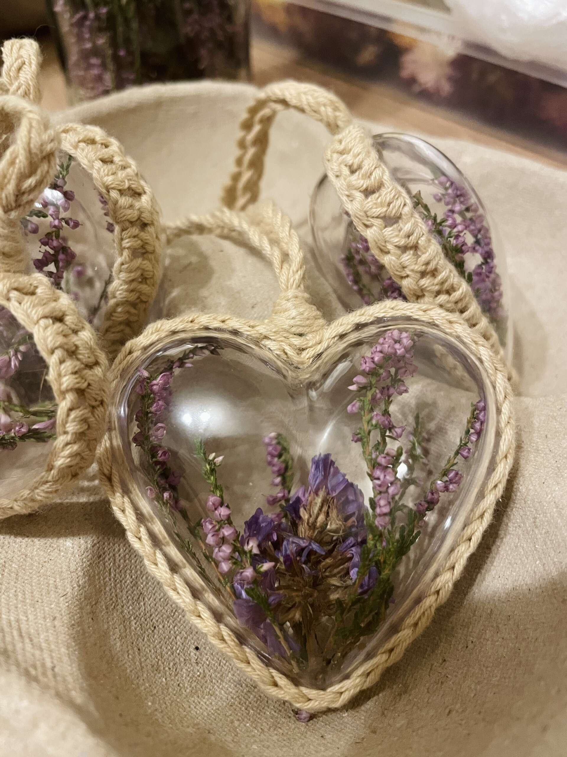 Akrylowe serduszka z fioletowym wrzosem i zatrwianem oraz włóczką 🙂