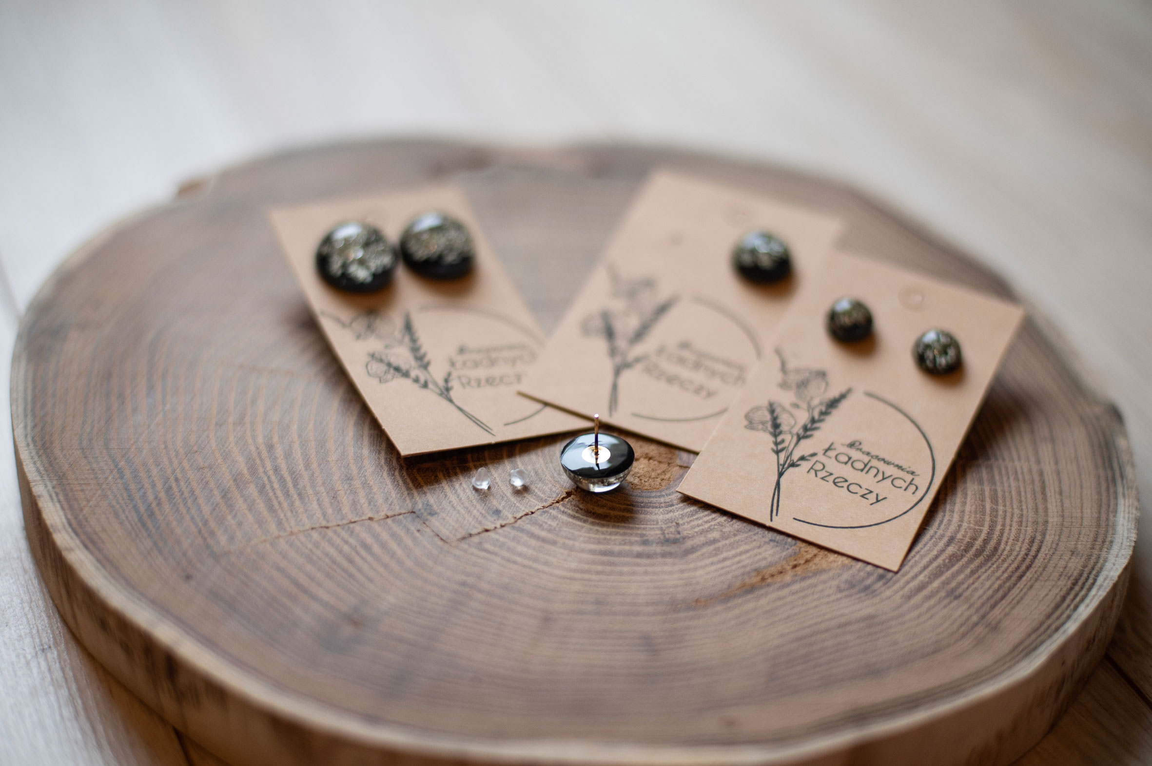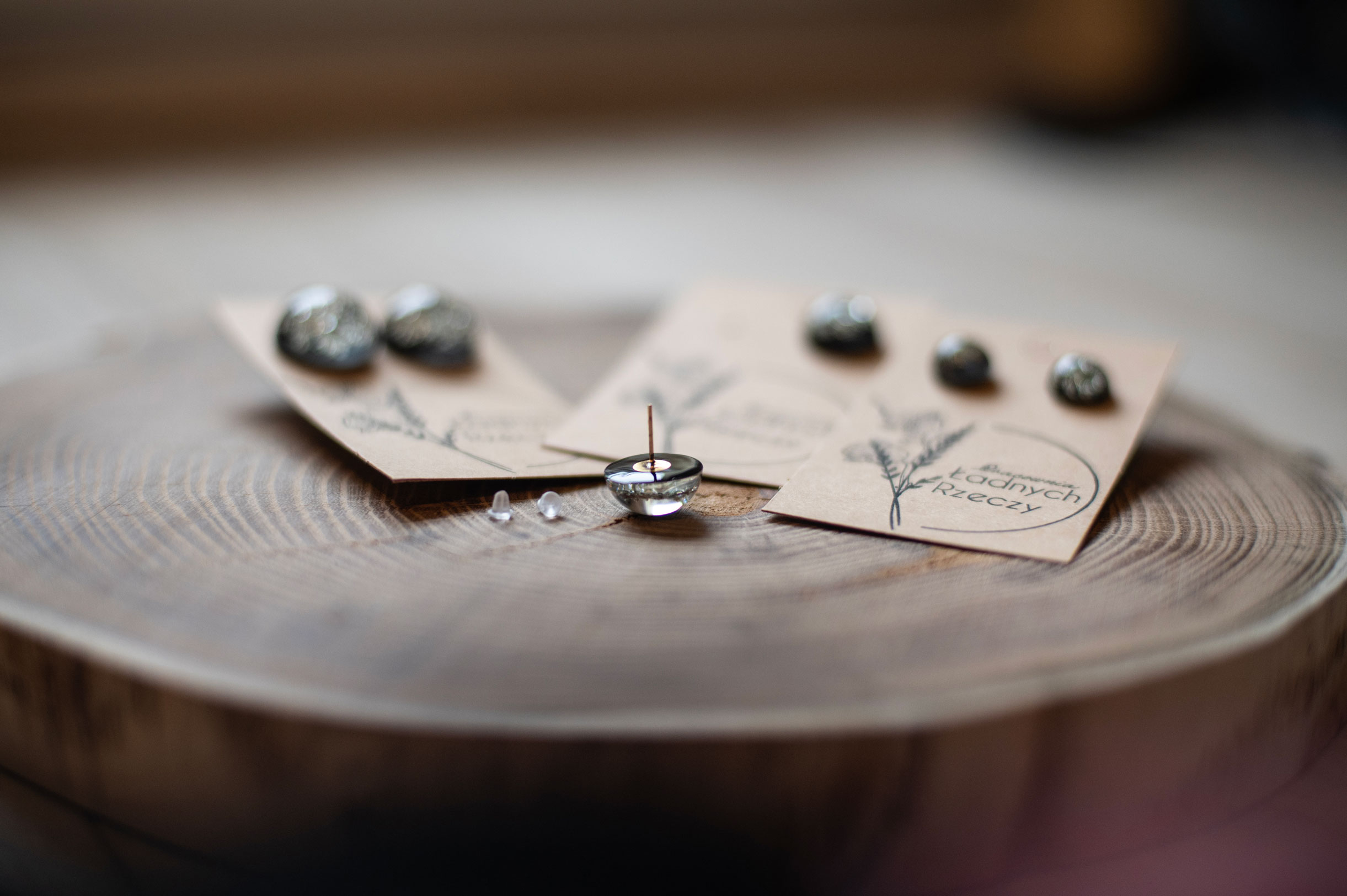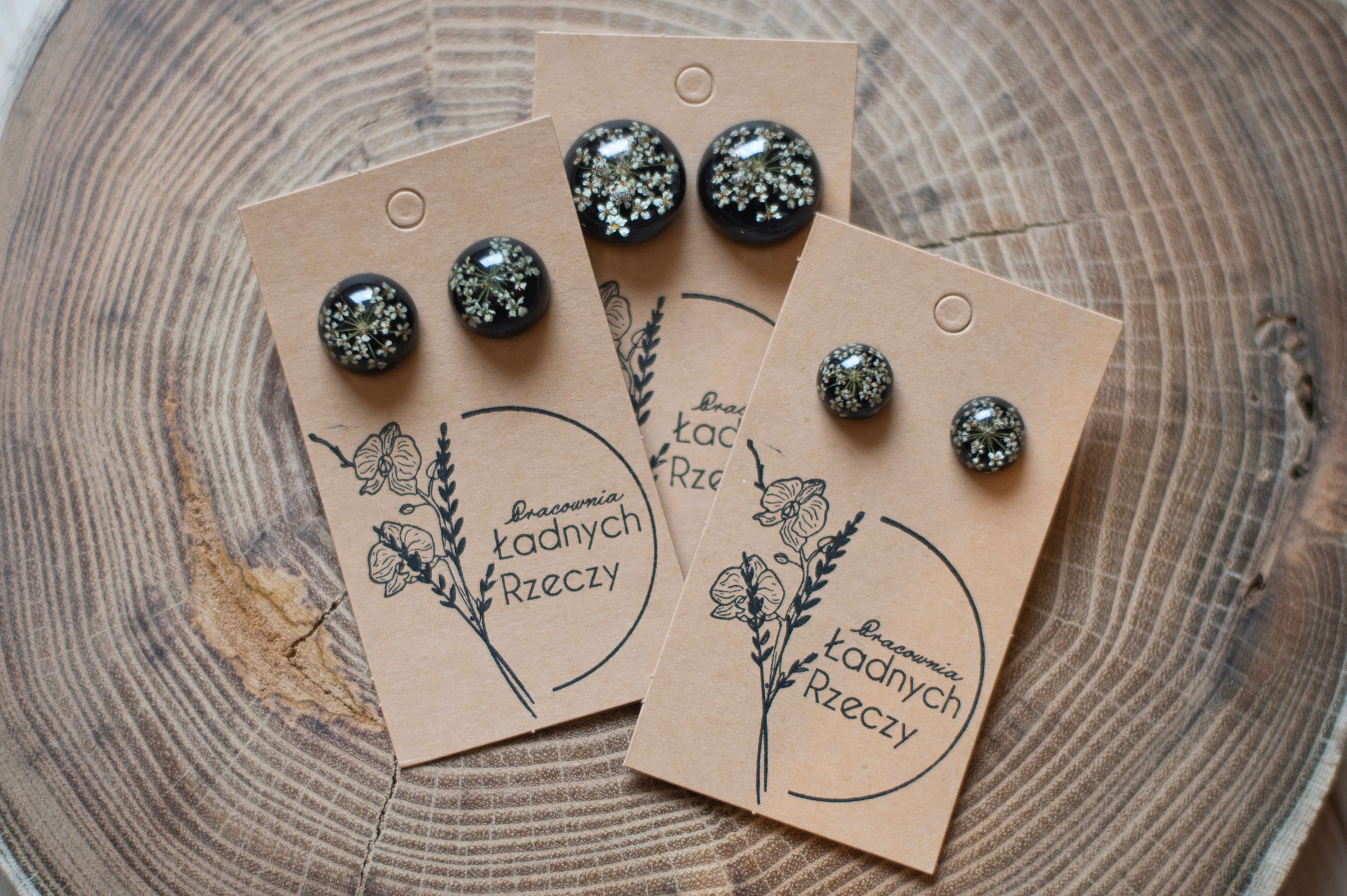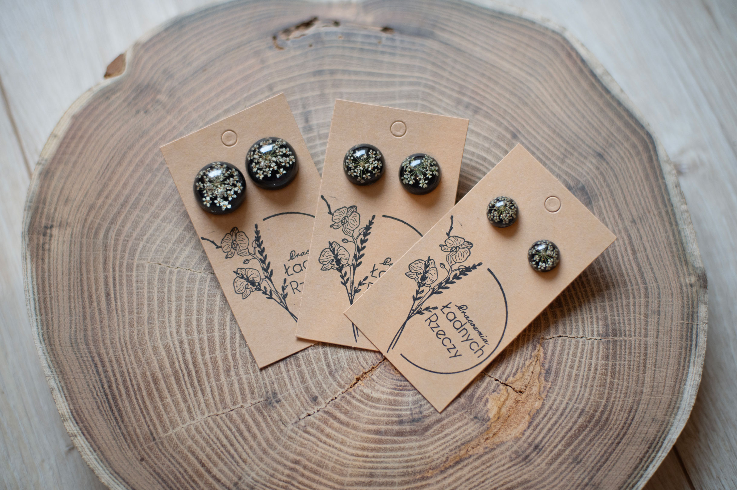 Kwiat dzikiej marchwi zatopiony w żywicy, na czarnym tle. Sztyft wykonany jest ze stali chirurgicznej.