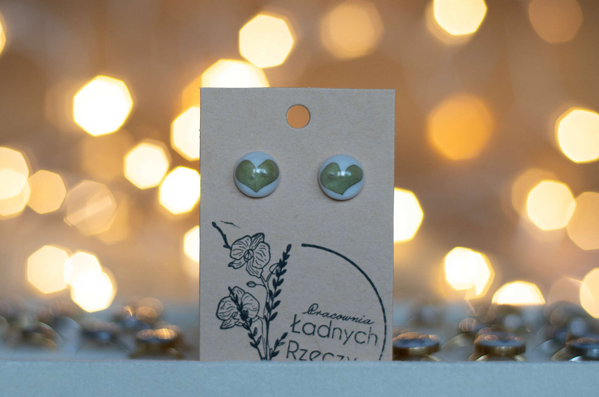 Listki w kształcie serca zatopione w żywicy, na białym tle. Sztyft wykonany jest ze stali chirurgicznej w kolorze srebrnym.