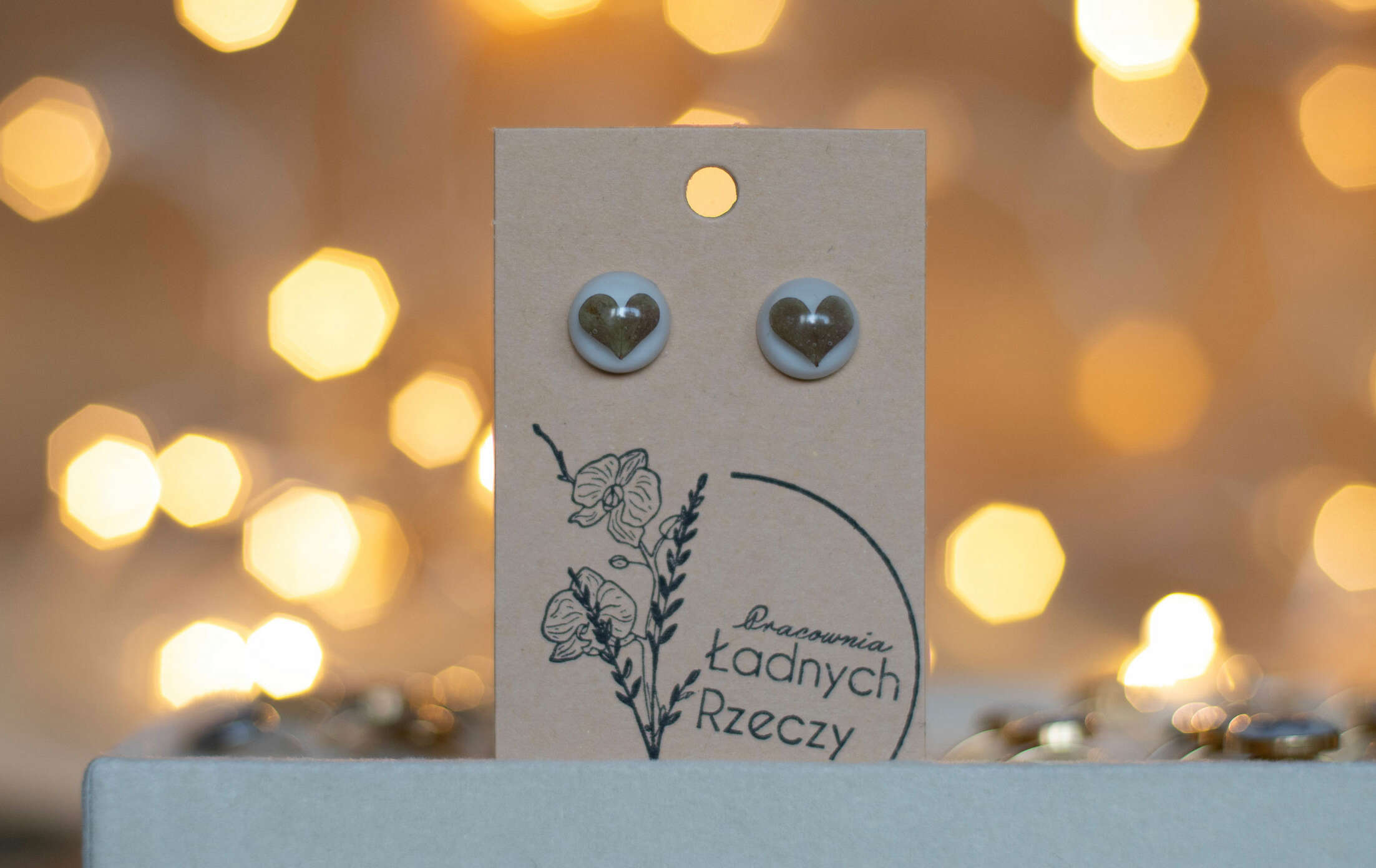 Listki w kształcie serca zatopione w żywicy, na białym tle. Sztyft wykonany jest ze stali chirurgicznej w kolorze złotym.