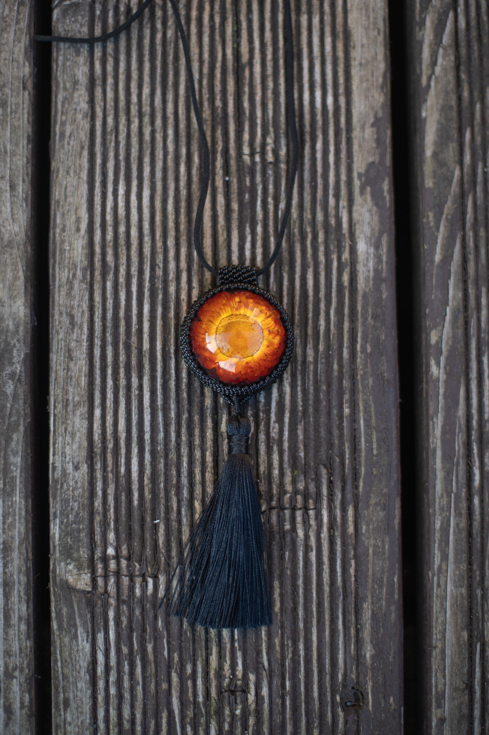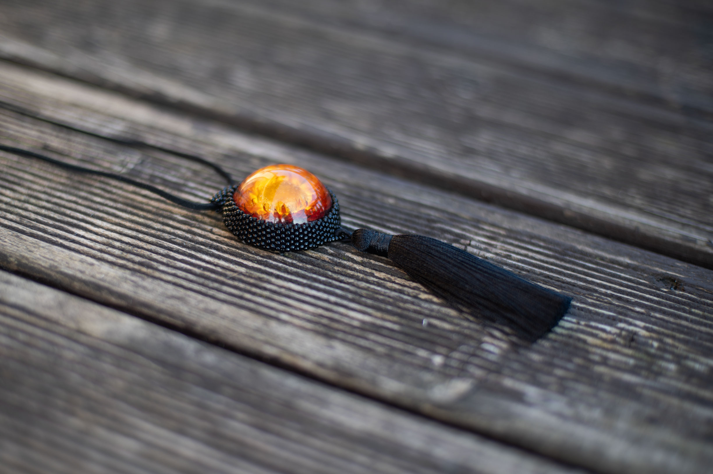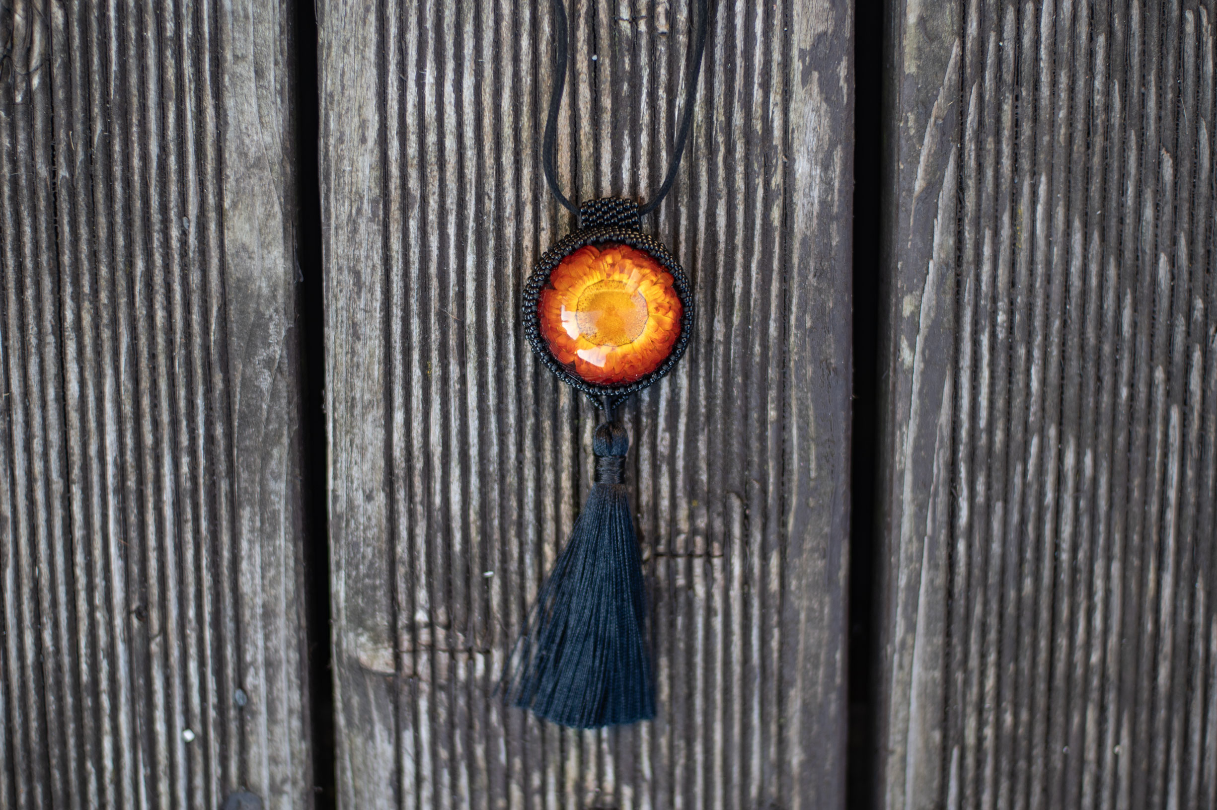 Kocanka zatopiona w żywicy. Całość została wykończona haftem koralikowym.