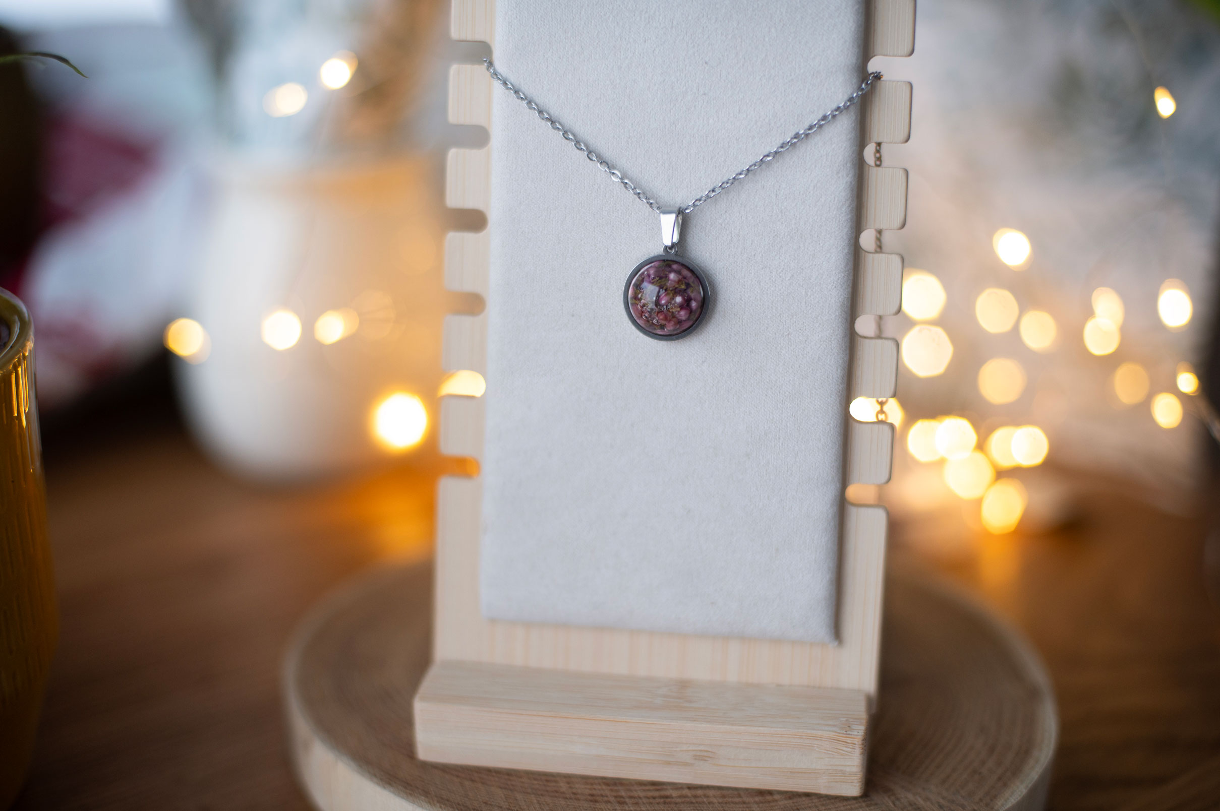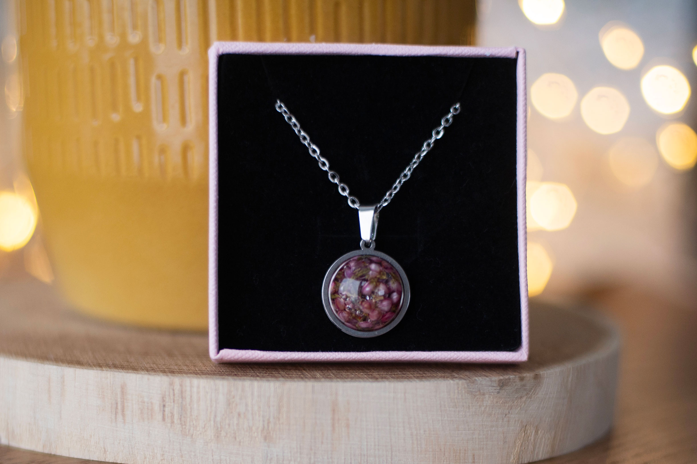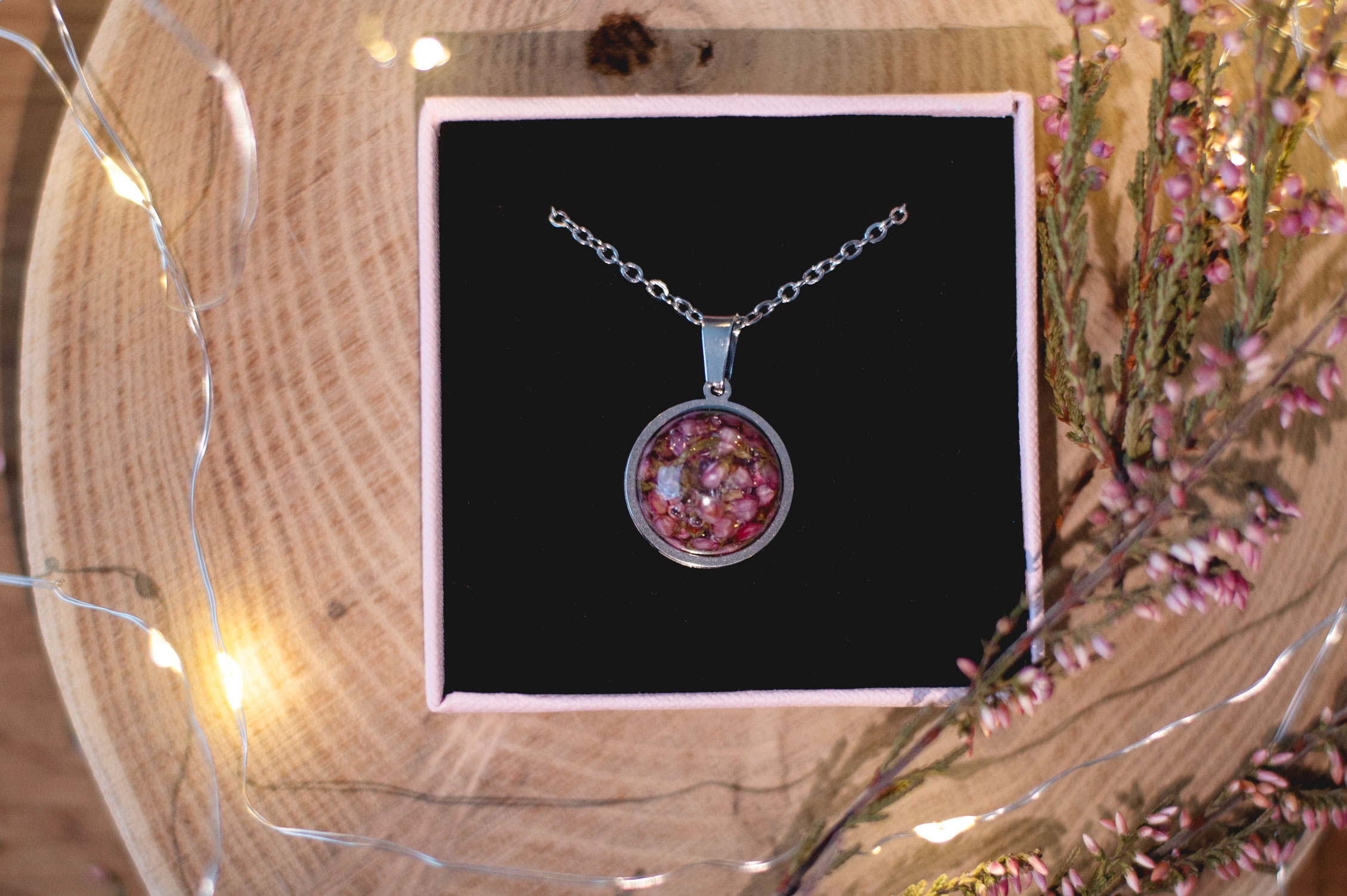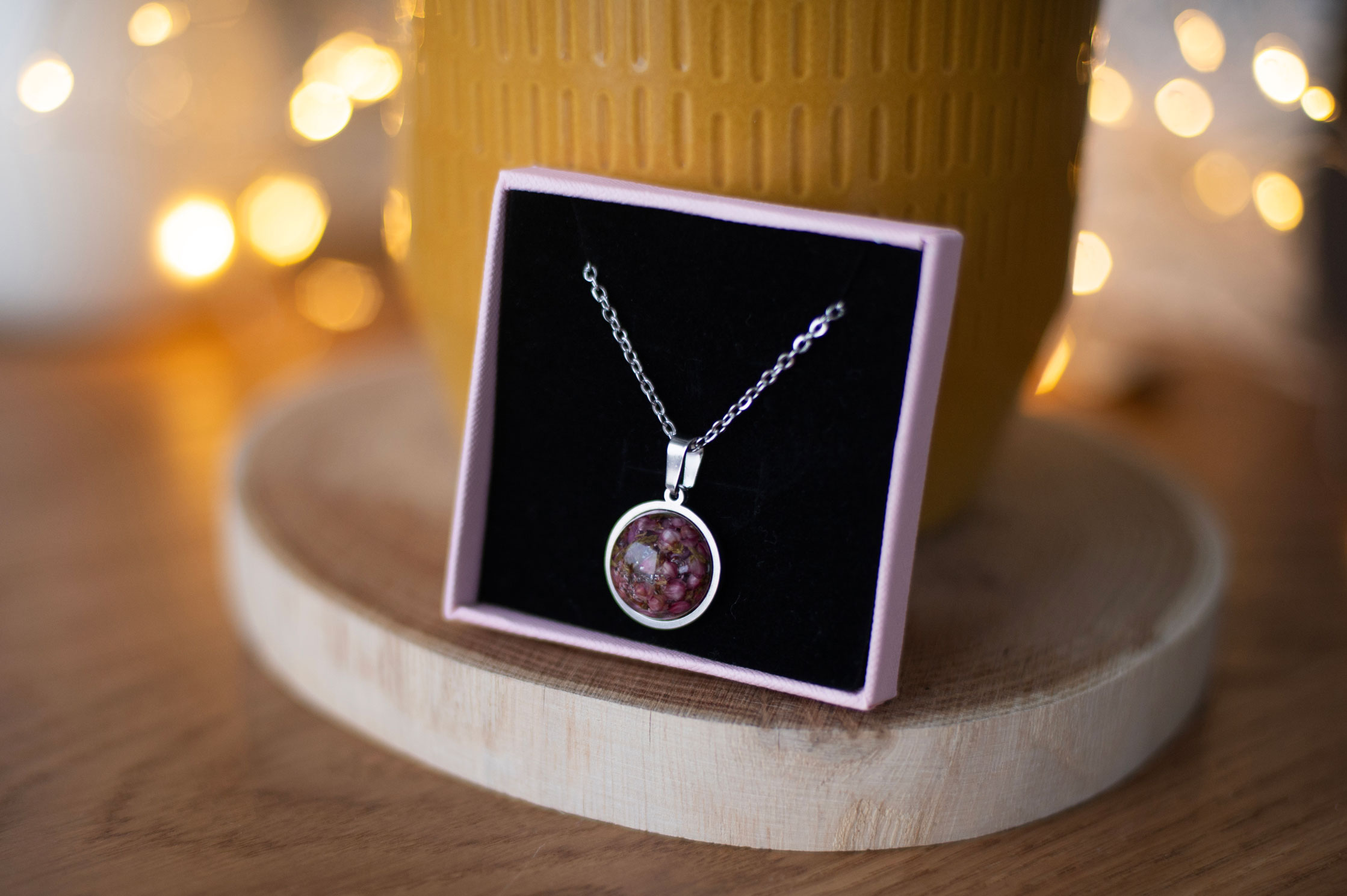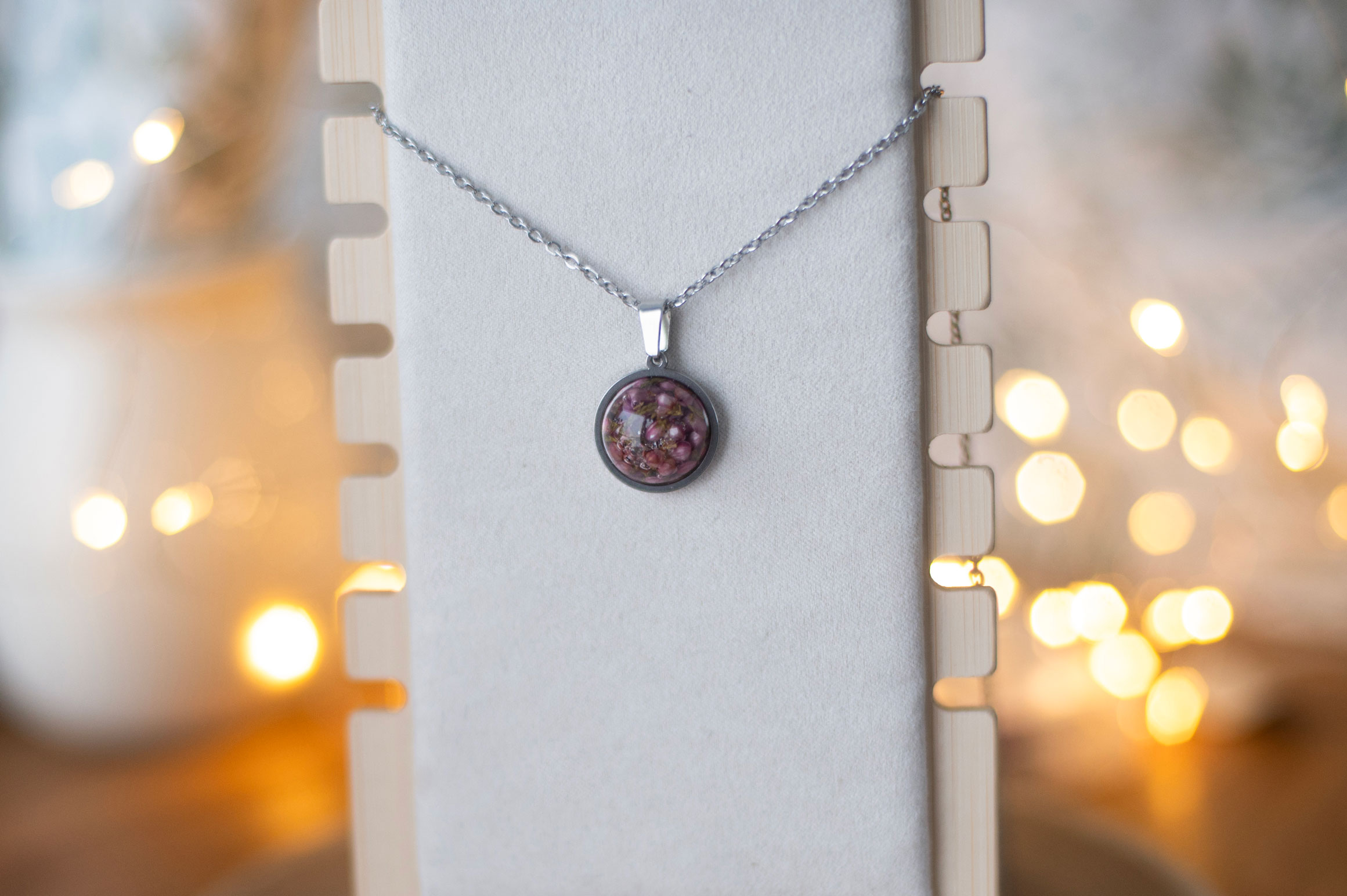 Wrzos zatopiony w żywicy. Baza wisiorka oraz łańcuszek wykonane są ze stali chirurgicznej.
