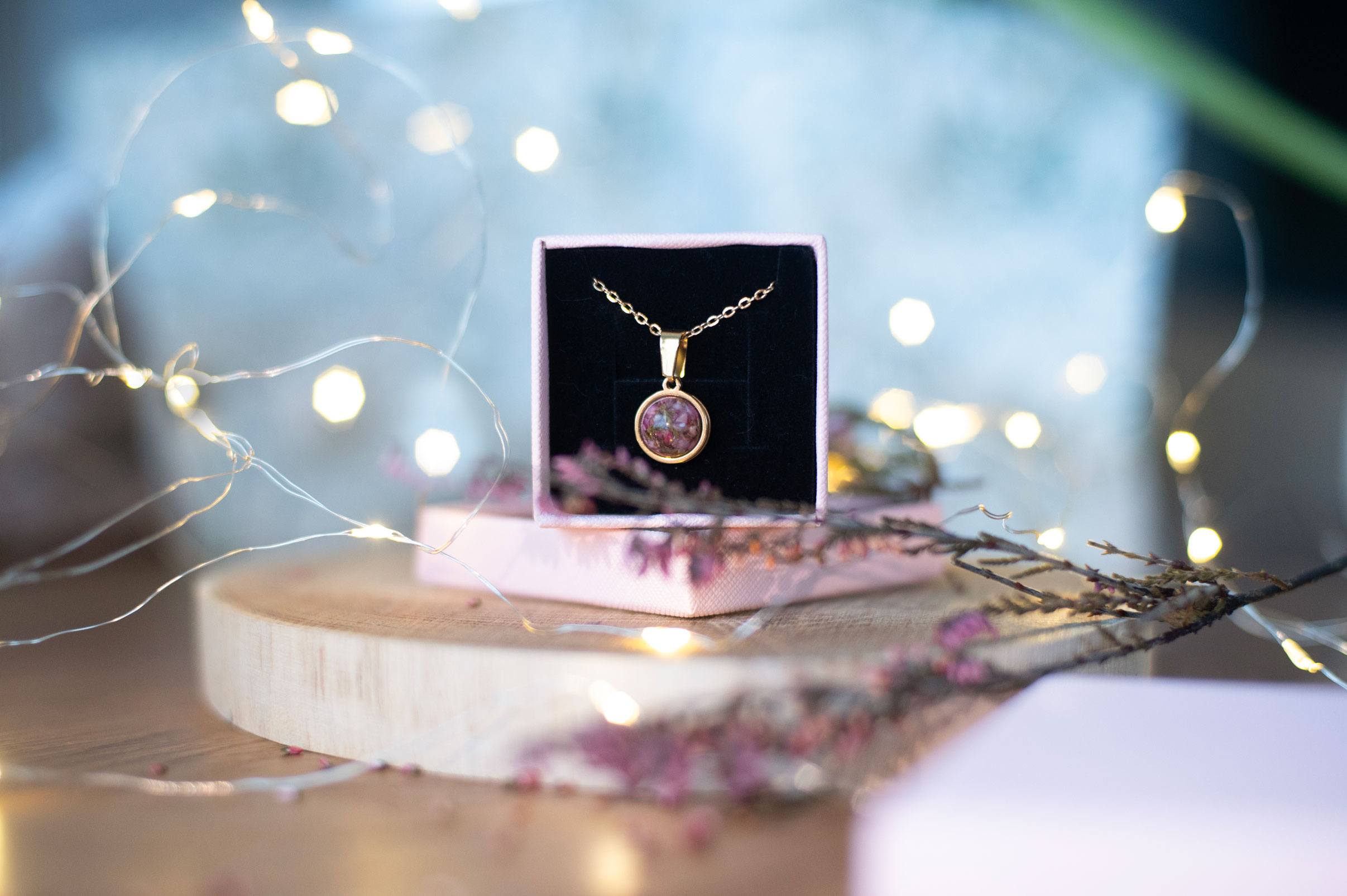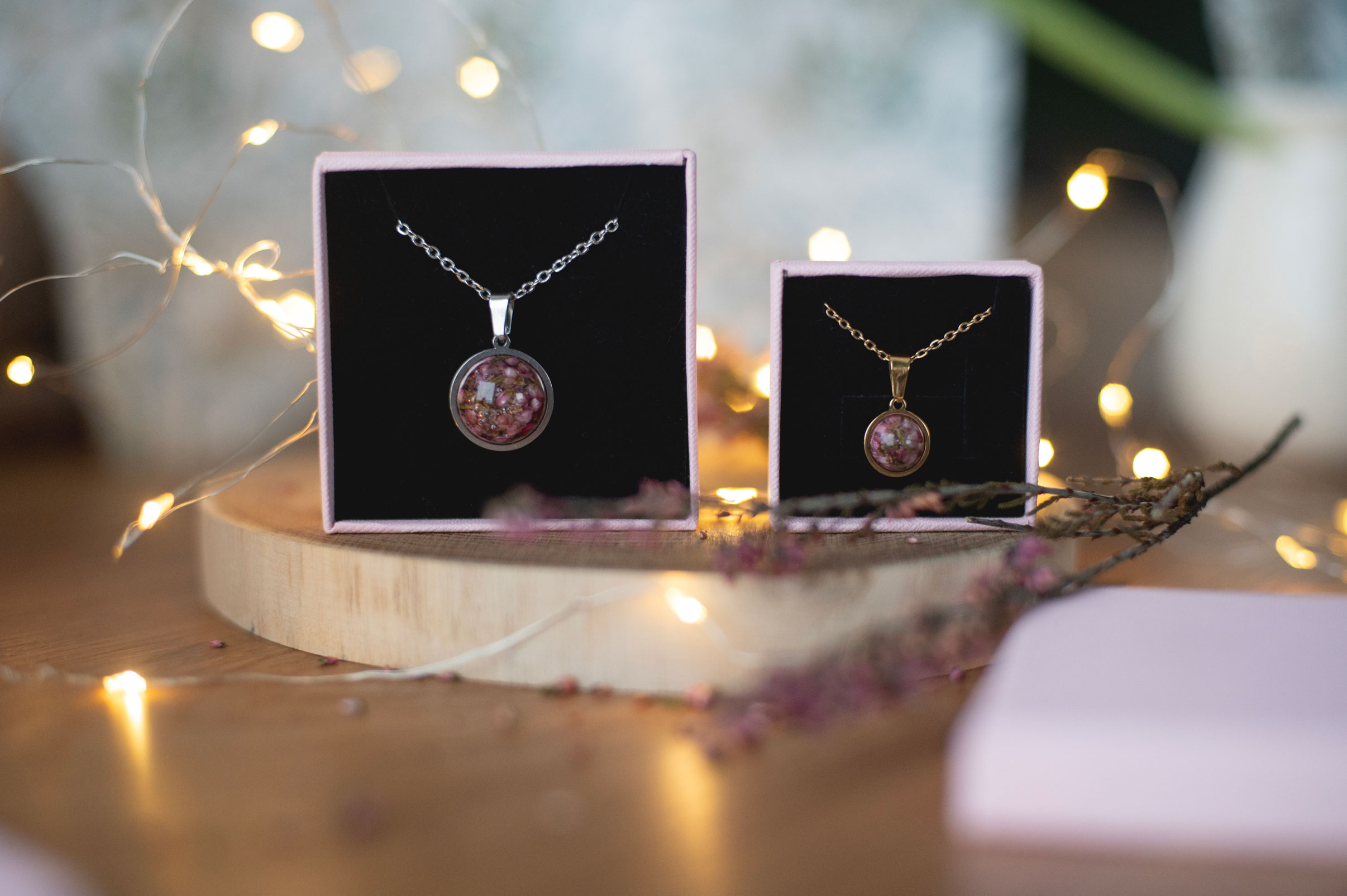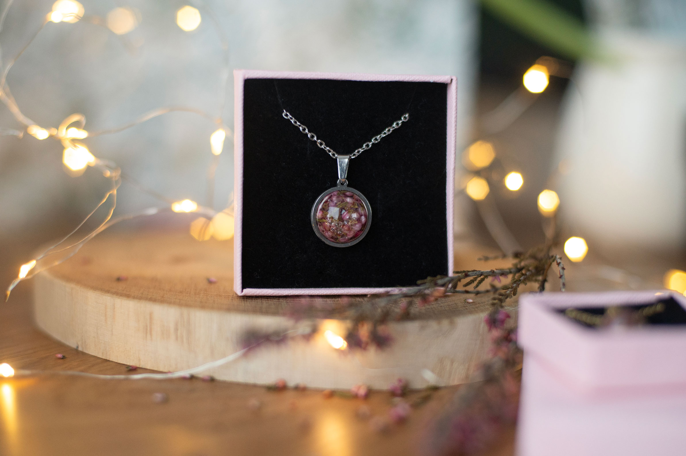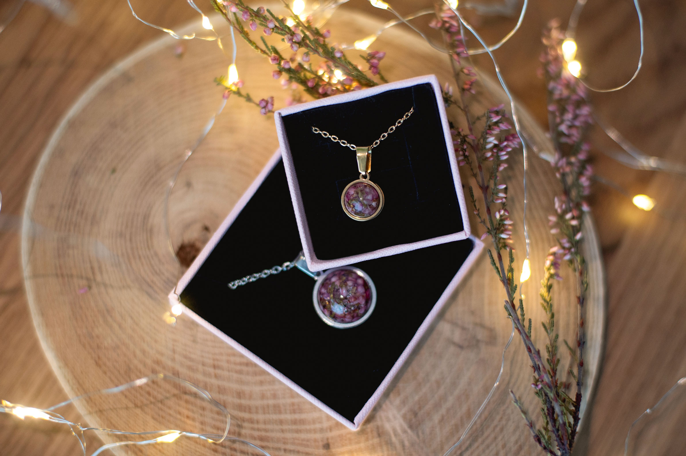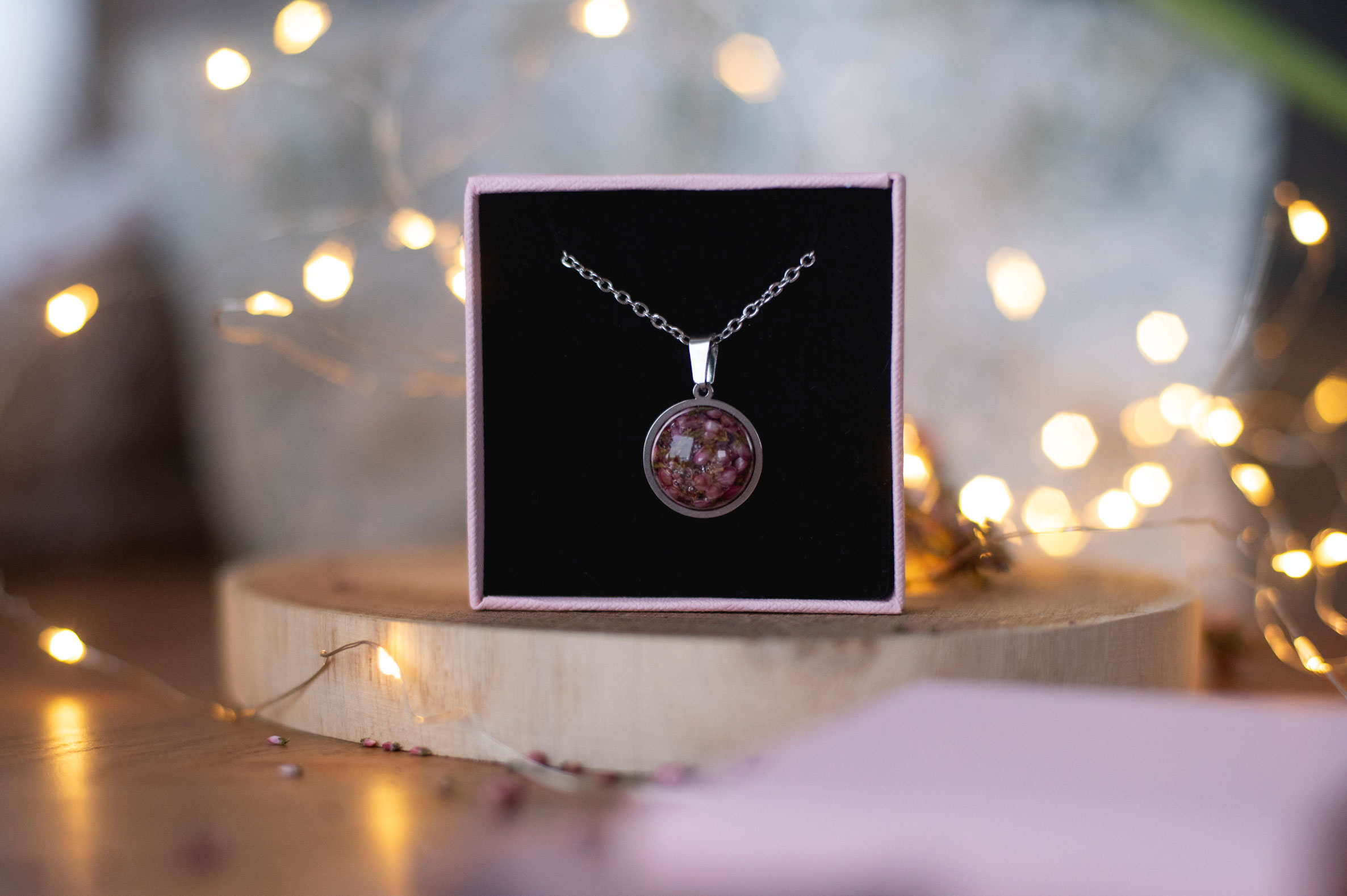 Wrzos zatopiony w żywicy. Baza wisiorka oraz łańcuszek wykonane są ze stali chirurgicznej.